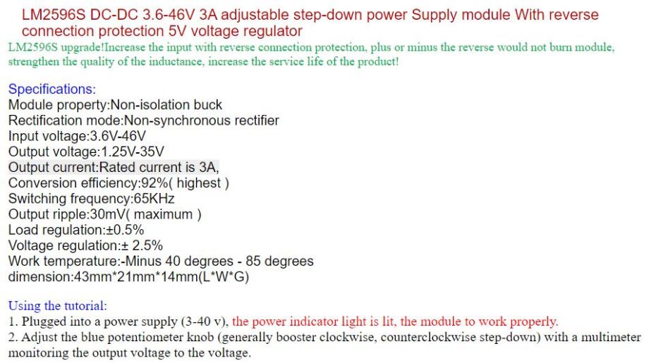 Ovaj modul ima mogućnost spuštanja ulaznog napona na točno određeni izlazni napon upotrebom trimer otpornika sa finom regulacijom.