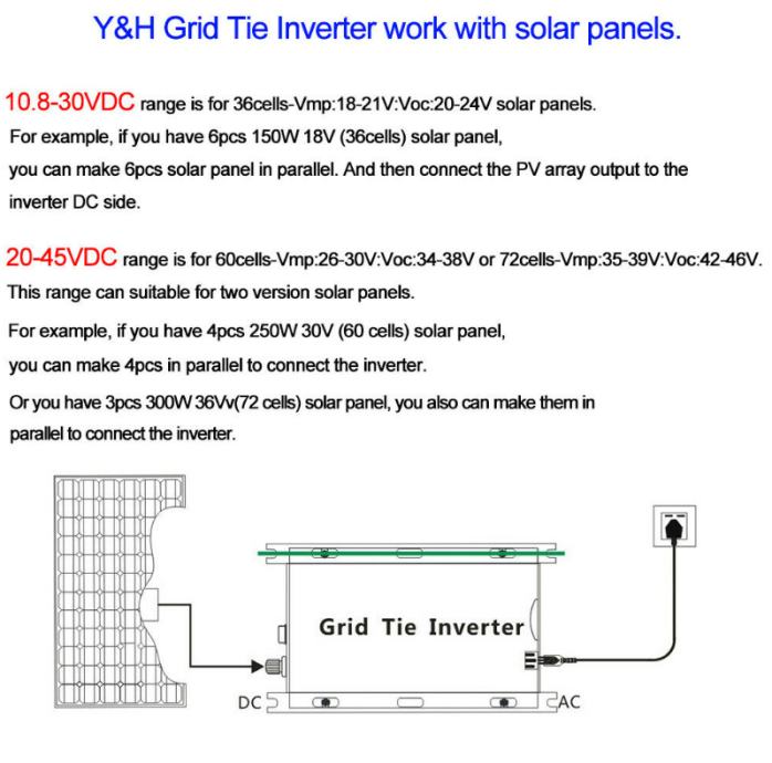 Uređaj može primiti do četiri (4) paralelno spojene ploče napona 36V i snage 350W (ili 3 jače), dok je na ulazu u inverter dozvoljen maksimalan istosmjerni DC napon od 20 - 45V. Naravno, nije dobro uređaj opteretiti na vrhu njegove snage dok broj ploča za start može biti i manji, minimalno 1 x 36V ali će tada ostvarena snaga biti proporcionalna broju ploča u istim vremenskim uvjetima. Dakle ukupna snaga instaliranih ploča ne smije preči 1.400W a paralelno mogu biti spojene ploče različite snage ali istog napona. Dobro je u plus vod prije invertera ugraditi osigurač 32A. Presjek vodova od ploča do invertera treba biti minimalno 10 mm2 ako se koristi puna snaga s ploča.
