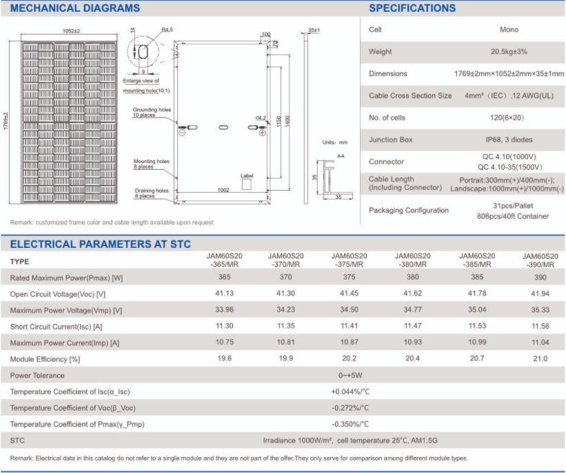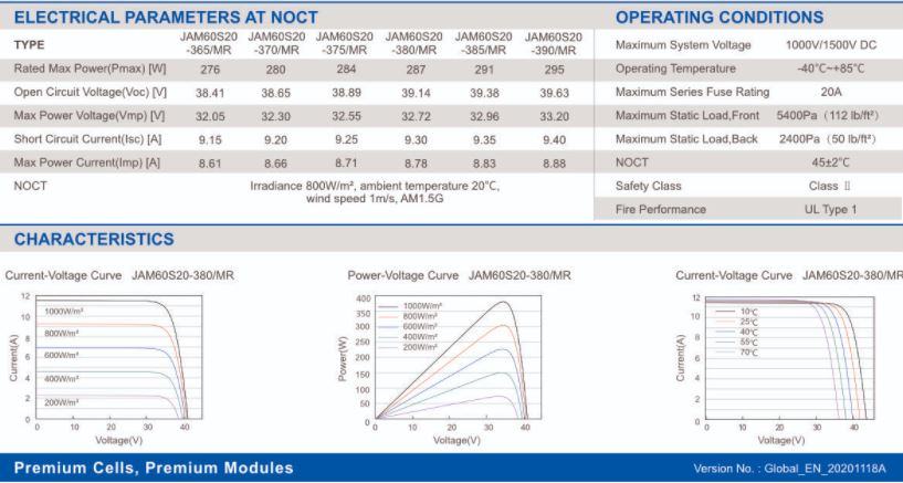 JAM60S20-380/MR je 380W Black celica 380W mono solarni panel za 24V sustav, eluirano aluminijsko kućište kućišta, 100cm kabelski priključak i MC4 konektori