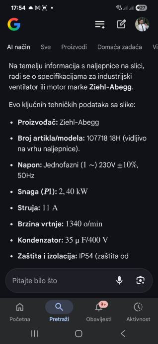 Motor Zeihl abegg + frenkvencijski invertek optidrive E3 za ventilacije preko 100m2 prostorav , 2,4 KW , 1340 okretaja u minuti.