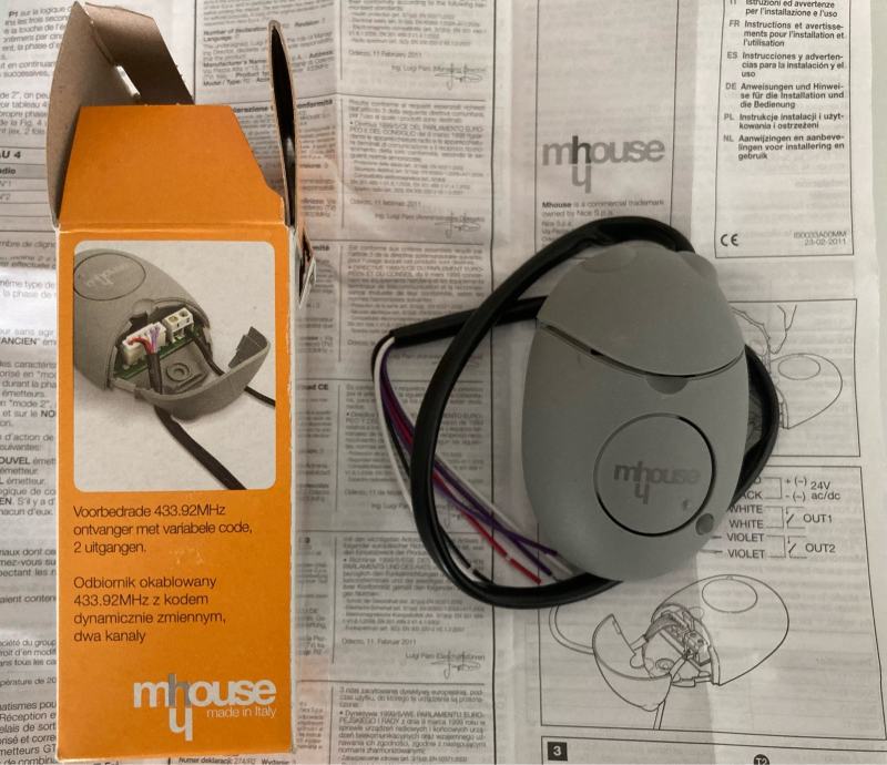 Prodajem novi zapakirani orginalni Mhouse R2 eksterni (vanjski) prijemnik (sa dva kanala) za radnu frekvenciju od 433,92MHz. Mhouse prijemnik koji se koristi za kapiju, garažna vrata ili za svjetlo.