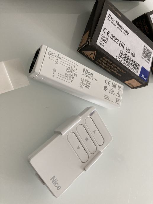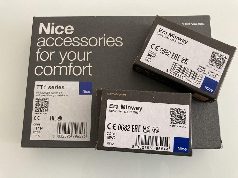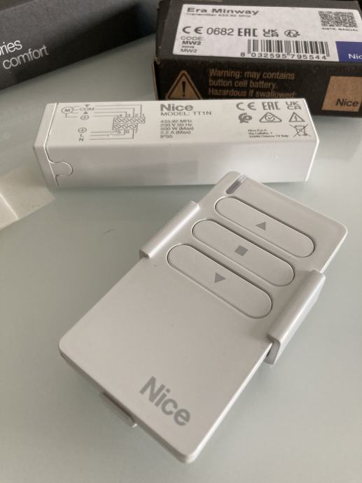 Prodajem novi model zapakirani Nice BIDI Awning prijemnik (koji zamjenjuje stari oznake Nice TT1N prijemnik) i za njega Era Minway jednokanalne Nice MW1, dvokanalne MW2 ili trokanalne MW3 daljinske upravljače sa stalkom za tende, rolete ili rolo vrata frekvencije 433,92MHz.