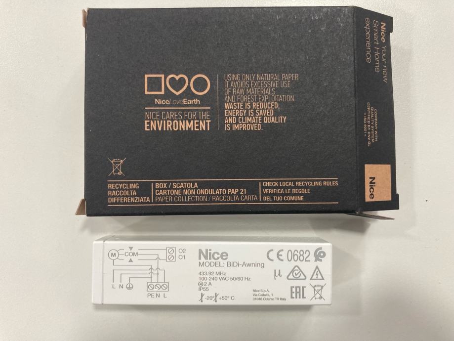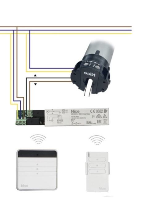 Upravljačka jedinica (prijemnik) Nice BIDI Awning može upravljati jednofaznim asinkronim motorima napajanim iz gradske mreže od 230V (npr. cijevni motori) s priključcima kao što su „ZAJEDNIČKI“, „GORE“, „DOLJE“ (stop tipka, tipka gore, tipka dolje) koji se koriste za automatizaciju tendi, roleta, rolovrata i slično. U upravljač je ugrađen radio prijemnik koji radi na frekvenciji od 433,92 MHz tehnologijom rolling codea i osigurava visoku razinu sigurnosti. Mogućnost programiranja do 30 odašiljača iz serije ERGO, PLANO, Era P, Era W, Era Time, Nice way Krono te VOLO S RADIO, Nemo WSCT, Nemo WSRT bežičnih senzora koji se može memorirati na svaki takav kontrolor. Nakon svake naredbe, motor se napaja za planirano radno vrijeme; električni granični prekidač u motoru prekida kretanje u željenom položaju. Sva programiranja mogu se izvršiti izravno s odašiljača, zvučni signal će voditi njihove različite faze. Ako koristite radio-kontrolirane vremenske senzore, npr. VOLO S RADIO, pomicanje tendi ili roleta može se automatski upravljati ovisno o vjetru, suncu ili kiši.