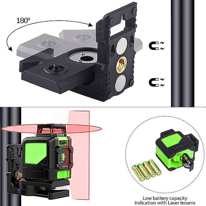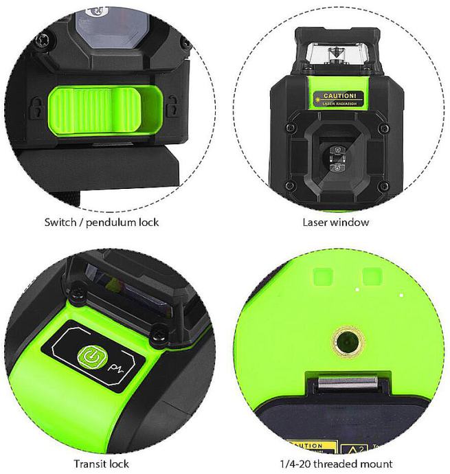 uključi na crveni gumb 0/1( pojavljuju se laserske zraka), otključaj nivelator na zeleni gumbu sa prednje strane ( u koliko se ne otključa laser če žmirkati svake 3 sekunde), kada se otključa laser se automatski nivelira. U koliko laser nije u dozvoljenim mjerama tolerancije za vagu javlja se žmirkanje lasera svake sekunde. može se uključiti svaka zraka posebno ili sve tri zajedno stiskanje gumba za paljenje