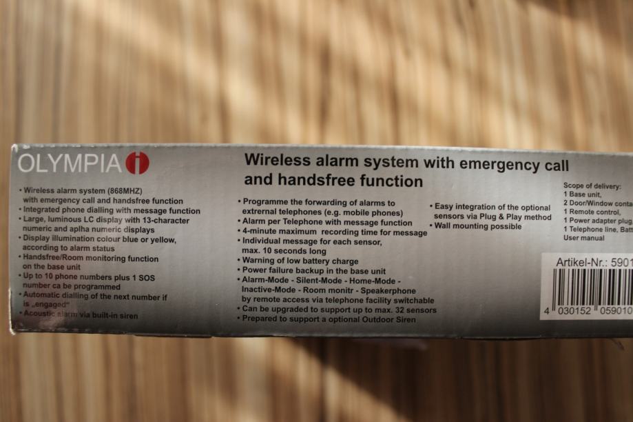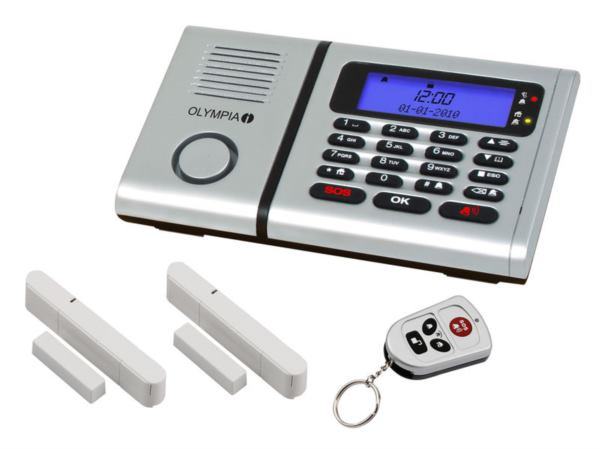 Komplet se sastoji od: 1 bazna jedinica, 2 vrata / prozor senzori, 1 Daljinski upravljač, 1 utikač mrežnog adaptera.