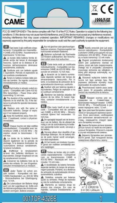 ••• Mogućnost prodaje Duracell baterije oznake CR2016 za Came daljinske upravljače (1par/2 komada = 6€.)