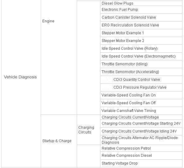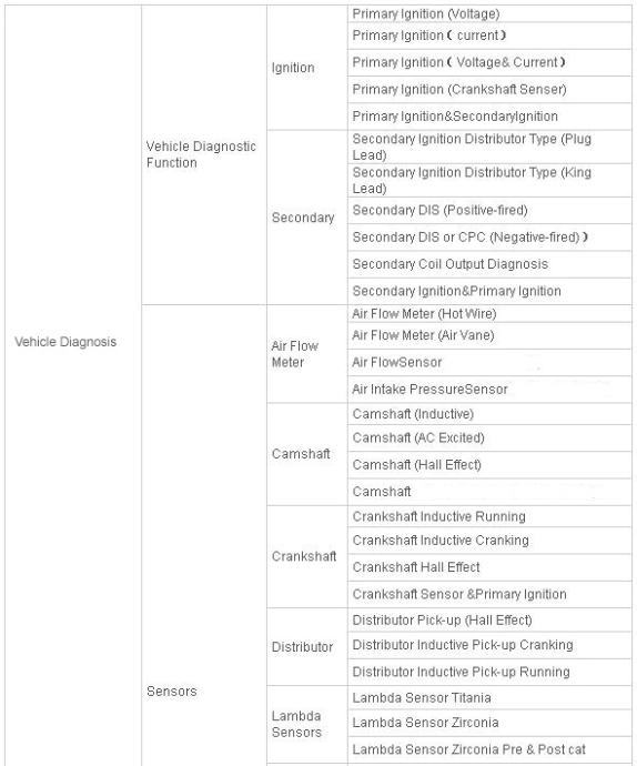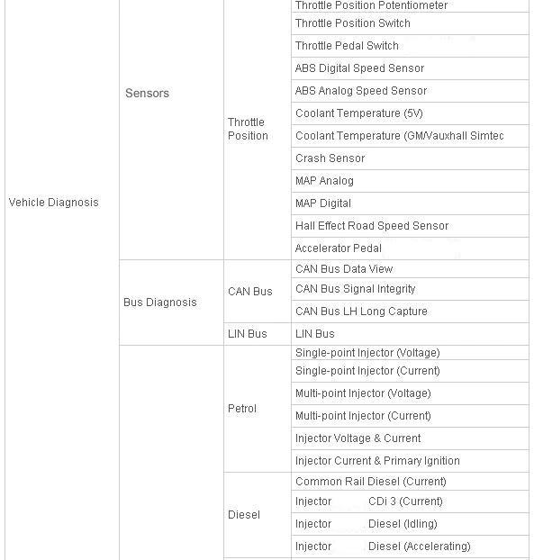 Ovaj osciloskop ima široku namjenu, a zbog broja kanala pogodan je za autodijagnostiku, te podržava autodijagnostičke procese ispitivanja senzora, simulacije senzora, radilice, bregastog vratila i ostalih senzora, istovremeno podržava i mjerenje oscilacija, te generator funkcija.