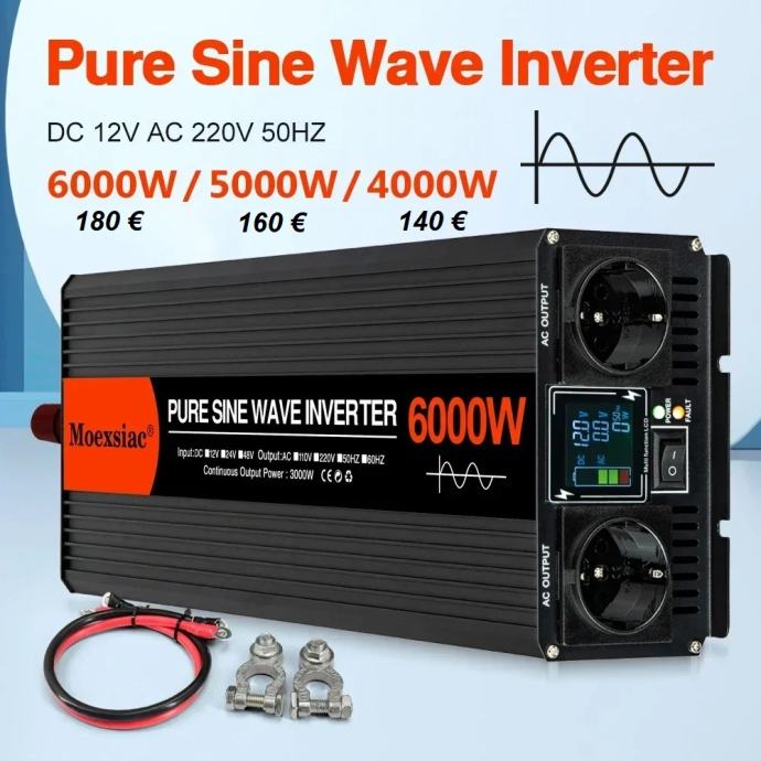 Pretvarač napona inverter 12V na 220V, čisti sinus, vršne snage 4000W, 5000W i 6000W