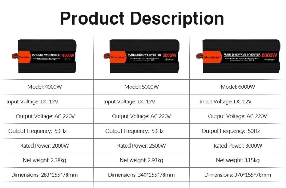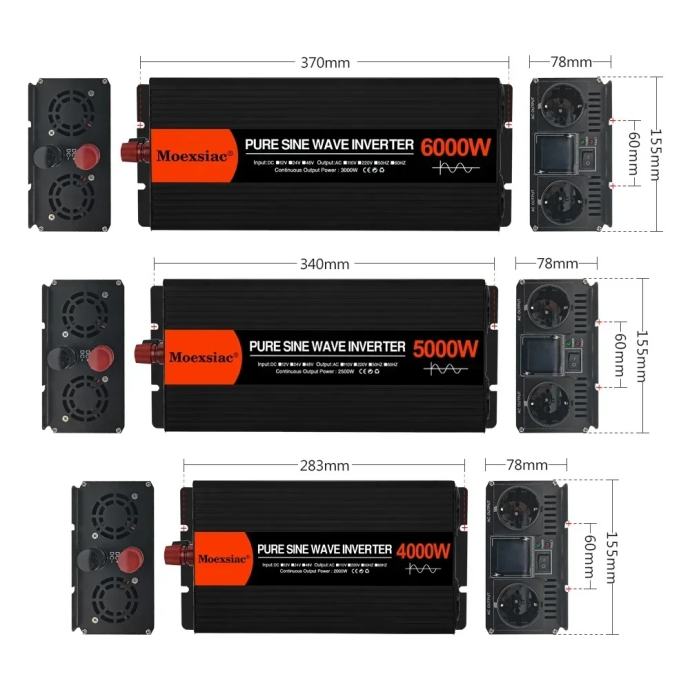 EU utičnica AC 220V izlaz 4000W 5000W 6000W inverter je svestrano rješenje za napajanje vaših kućnih električnih potreba. Dizajniran za DC 12V ulaz, ovaj inverter je savršen za solarne sustave, mikro invertere u automobilima i razne druge primjene. S vršnom izlaznom snagom od 6000W, 5000W ili 4000W, ovisno o vašim specifičnim zahtjevima, ovaj inverter osigurava vam pristup stabilnom i pouzdanom napajanju.
