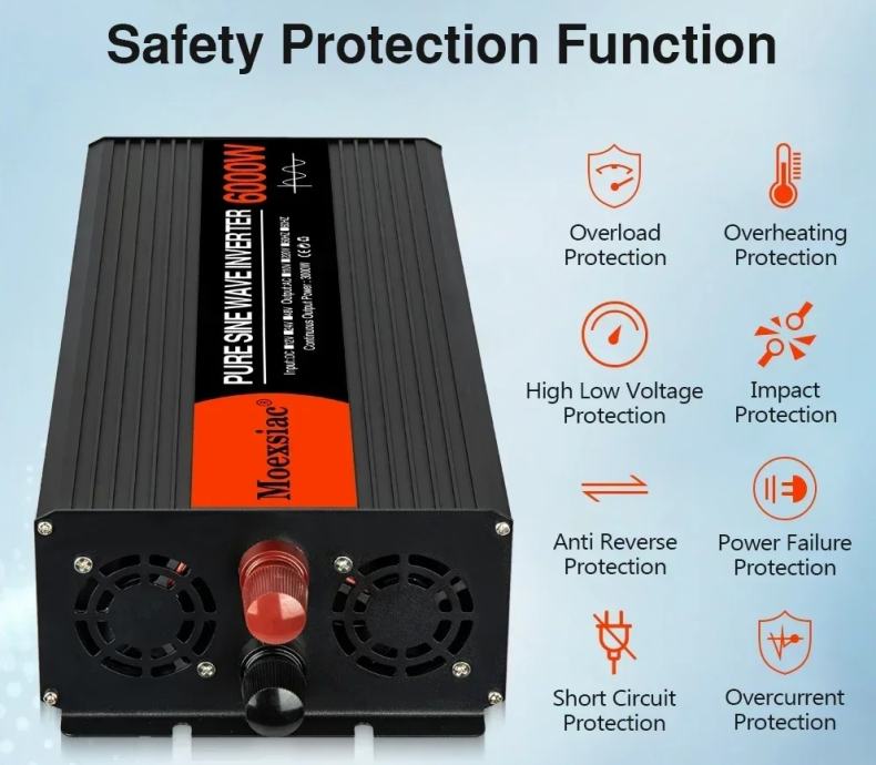 Sigurnost je kod ovog invertera najvažnija. Opremljen je alarmom za niski napon na 10 DC±0,5 V i isključivanjem pri niskom naponu na 9,5 DC±0,5 V kako bi se spriječilo oštećenje vaših uređaja. Osim toga, inverter ima zaštitu od preopterećenja, kratkog spoja, previsoke temperature, obrnutog polariteta, podnapona i preniskog napona te zaštitu ventilatora za hlađenje kako bi se osigurala vaša sigurnost i dugovječnost vaše opreme. Funkcija mekog pokretanja invertera osigurava glatko pokretanje, smanjujući opterećenje vaših uređaja i produžujući njihov vijek trajanja.