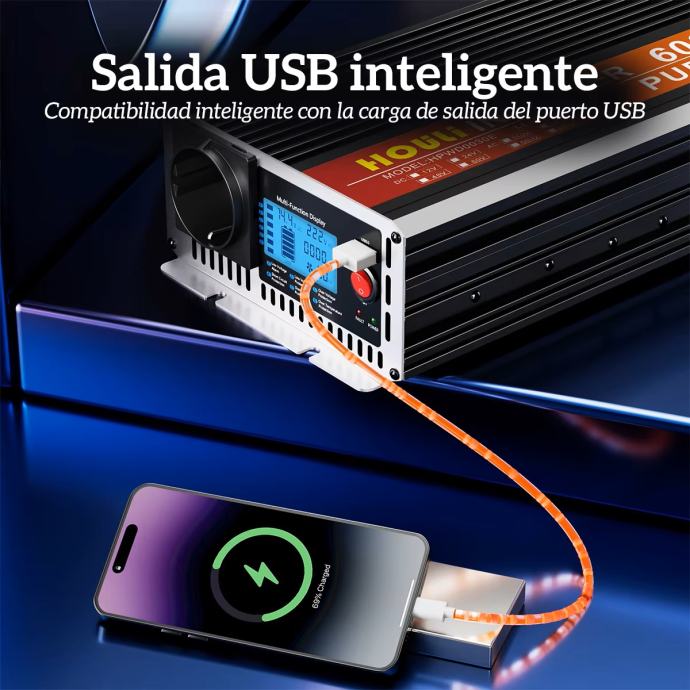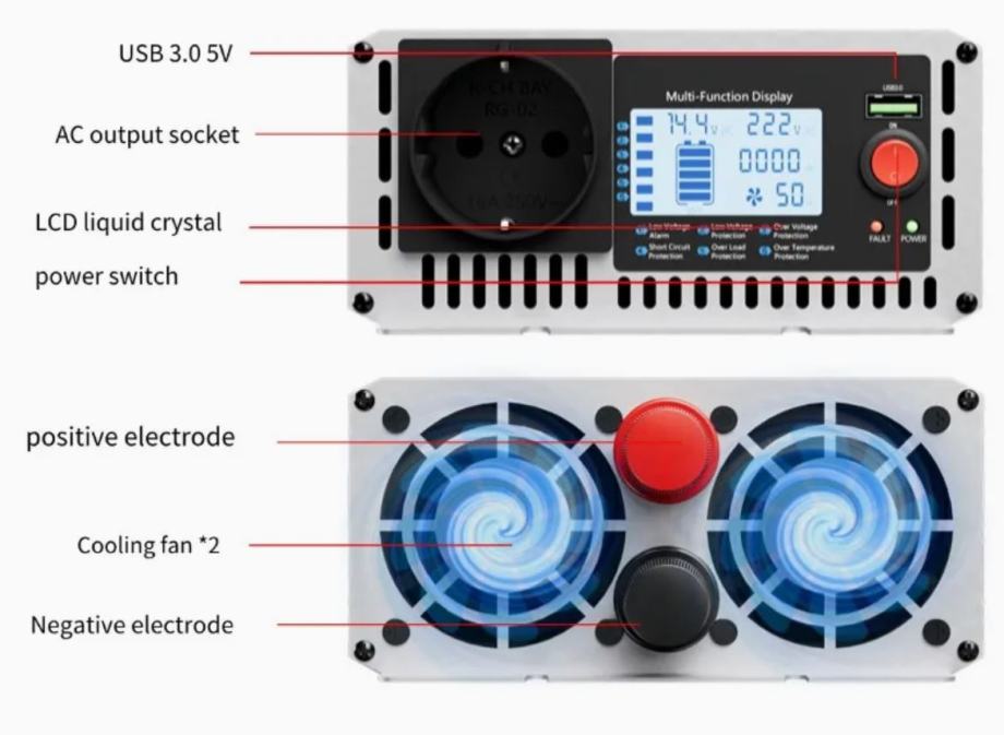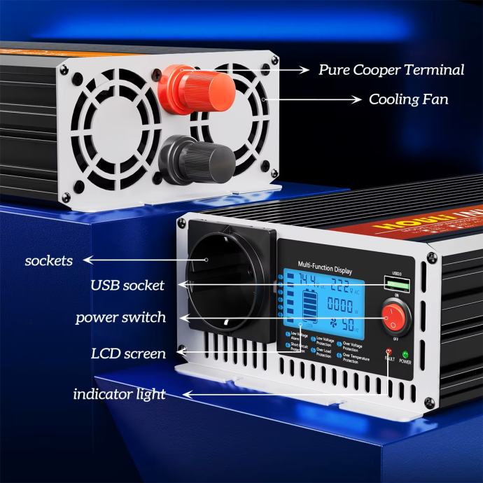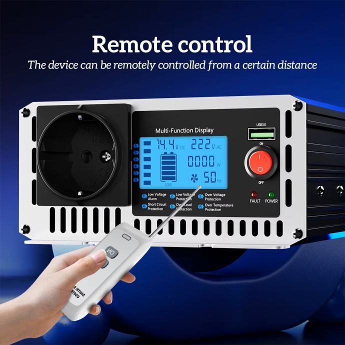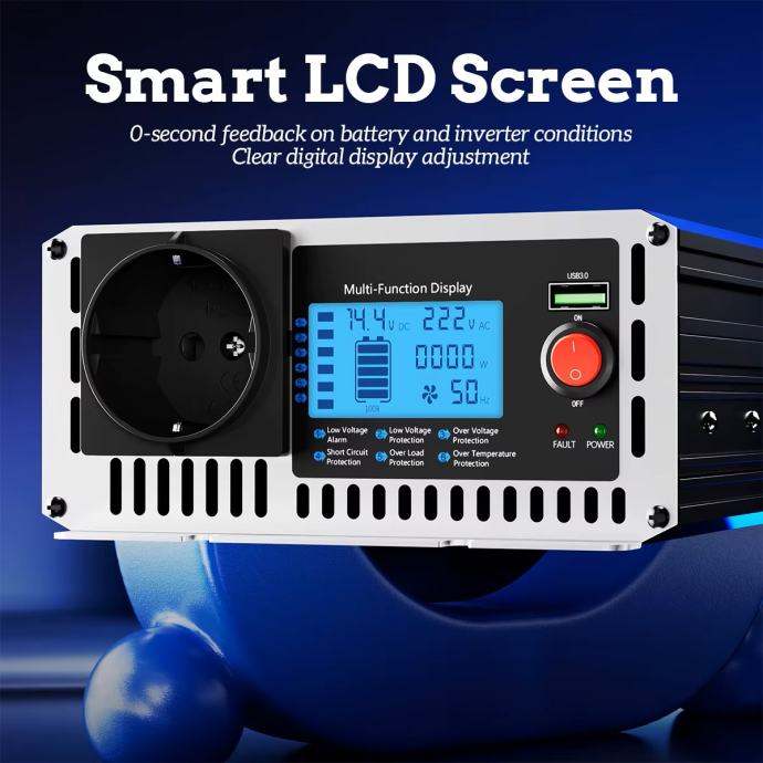 Inverter ima na izlazu EU utičnicu i USB potr te LCD digitalni zaslon koji pokazuje ulazni i izlazni napon te snagu.