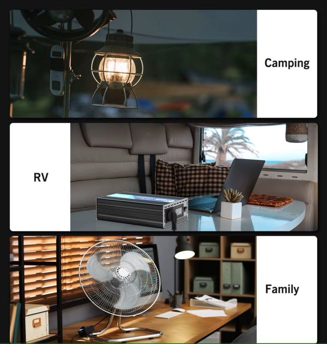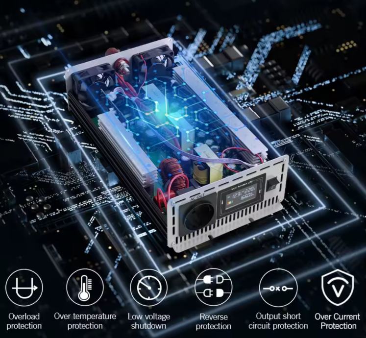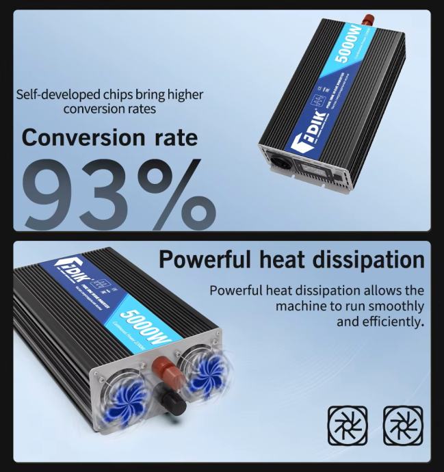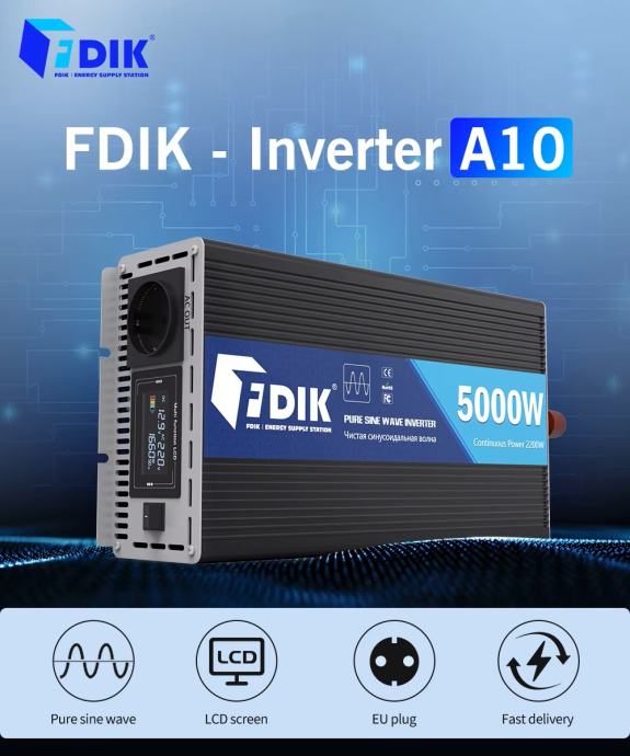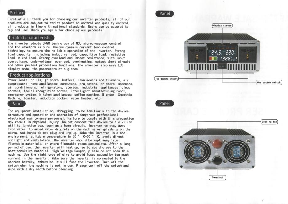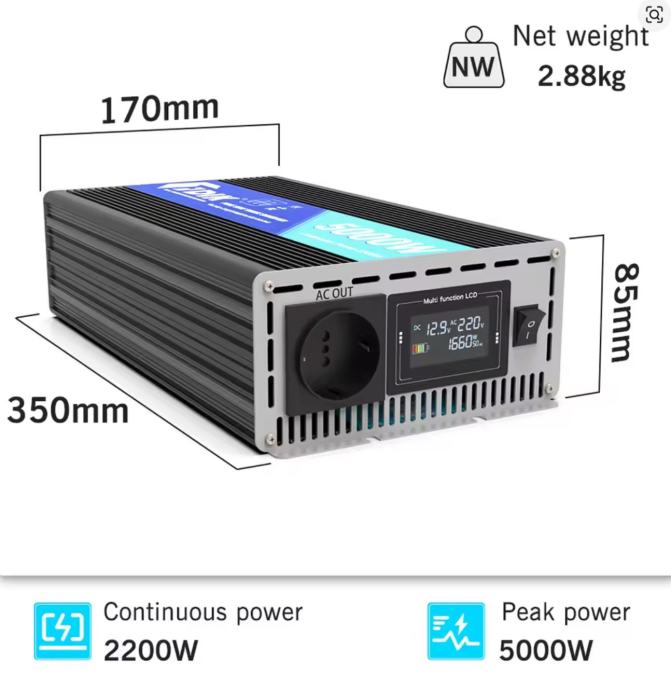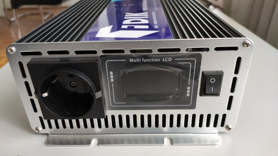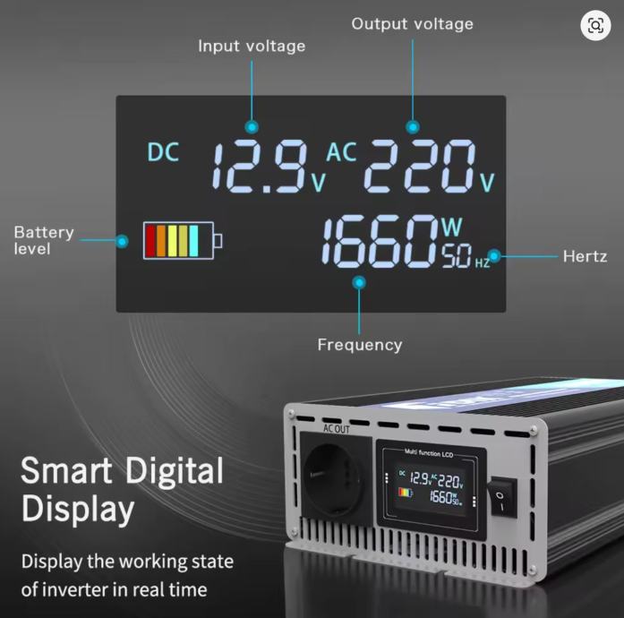 Inverter ima na izlazu EU utičnicu i LCD zaslon koji pokazuje ulazni, izlazni napon i snaga.