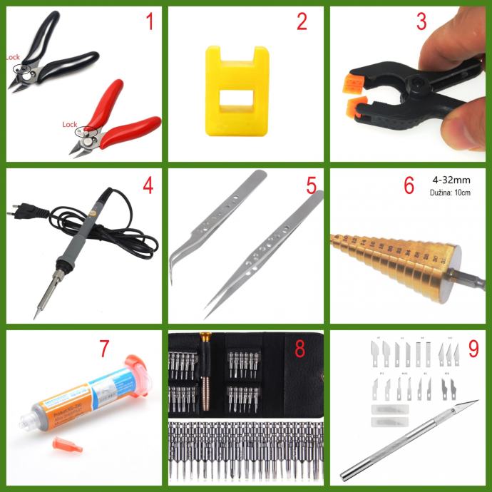 Pribor za lemljenje, elektronika, lemilica, tinol, pincete, skalpel...