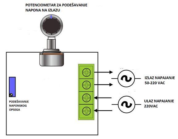 Potenciometrom se podešava izlazni napon a samim time i brzina odnosno snaga uređaja koji je priključen na regulator.