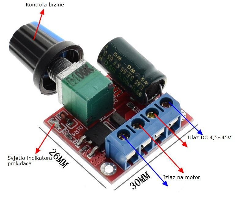 Namjestite gumb potenciometra za promjenu radnog ciklusa izlaza regulatora, promjena brzine motora.