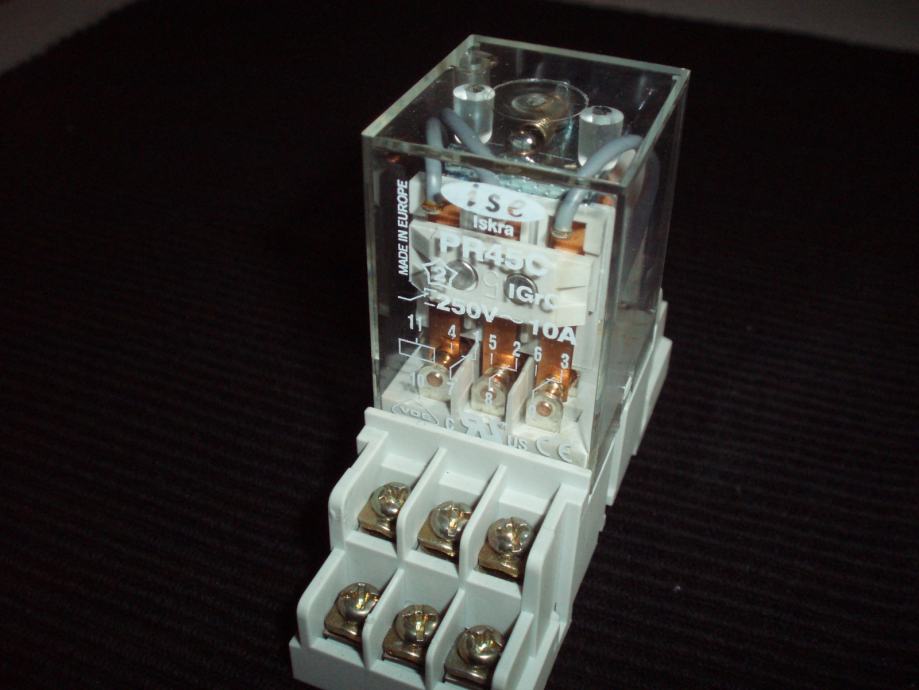 7. Relej Iskra PR45C s podnožjem za DIN šinu 230VAC s 3 preklopna kontakta 10A, 40 + 40 kn