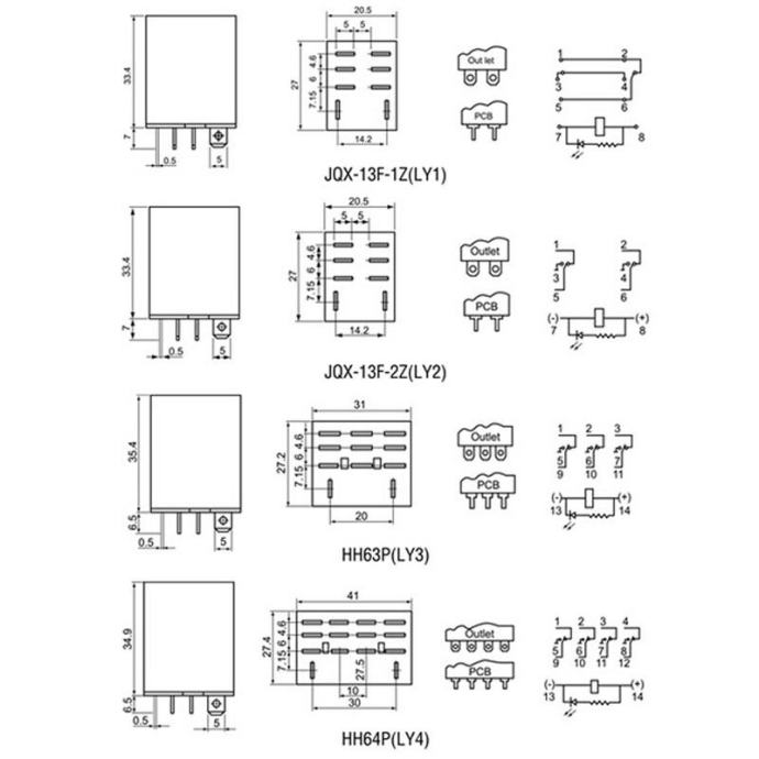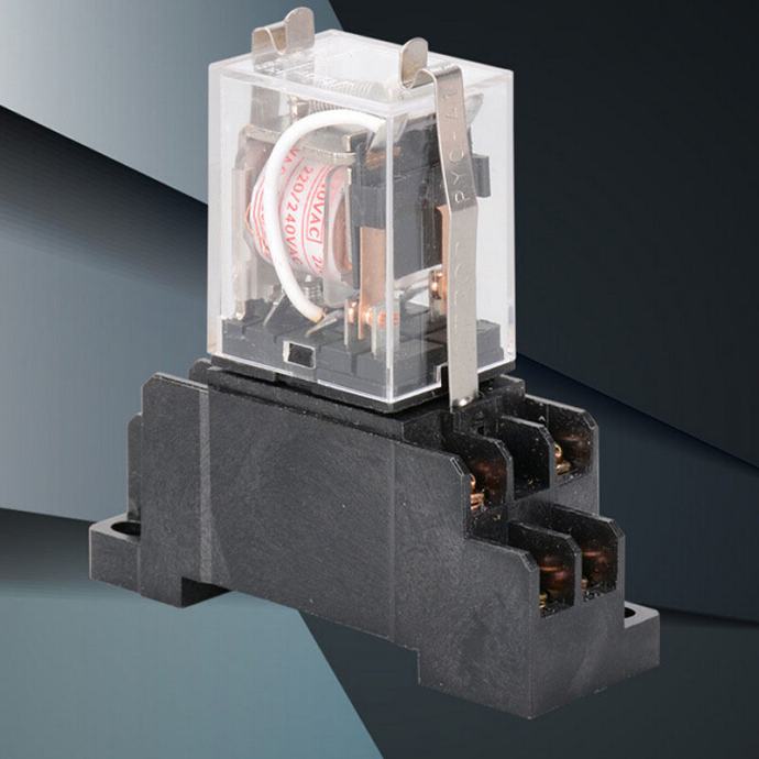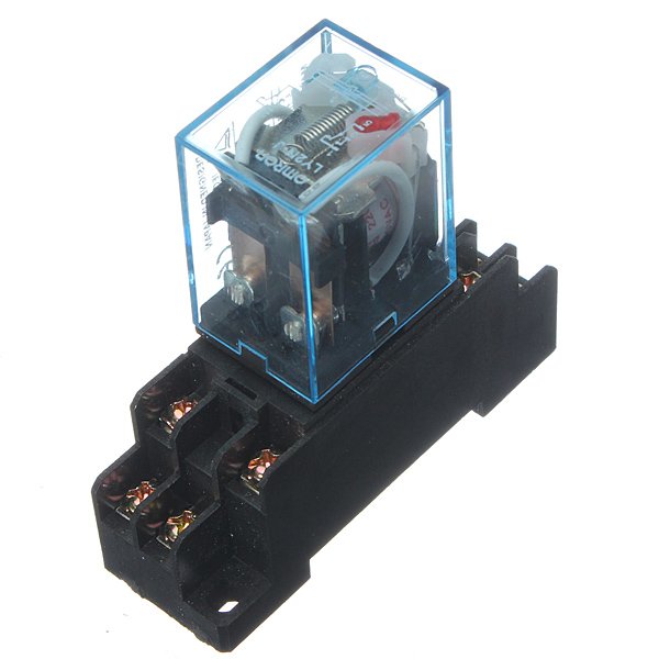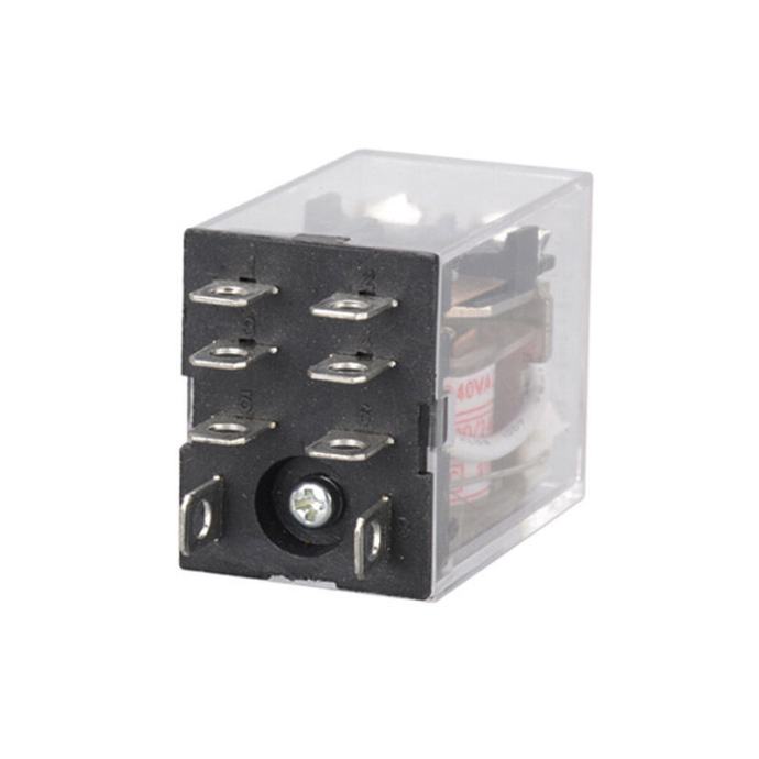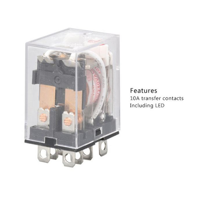 Mali i jeftini releji 10A za razne namjene, dostupni u varijanti sa 12VDC, 24VDC zavojnicom ili 220VAC zavojnicom. Dolaze sa podnožjem koje se može montirati na razdjelnicu ili zašarafiti na podlogu. 8 nožica od toga: 2 su za zavojnicu a 6 za 2 neovisna izmjenična kontakta.