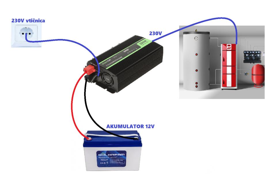 Inverter se preprosto vklopi v omrežje hišne vtičnice 230V na njega se namesti AGM/UPS akumulator in na zadnji strani se vklopi porabnika kot je centralna peč z črpalko pretoka.