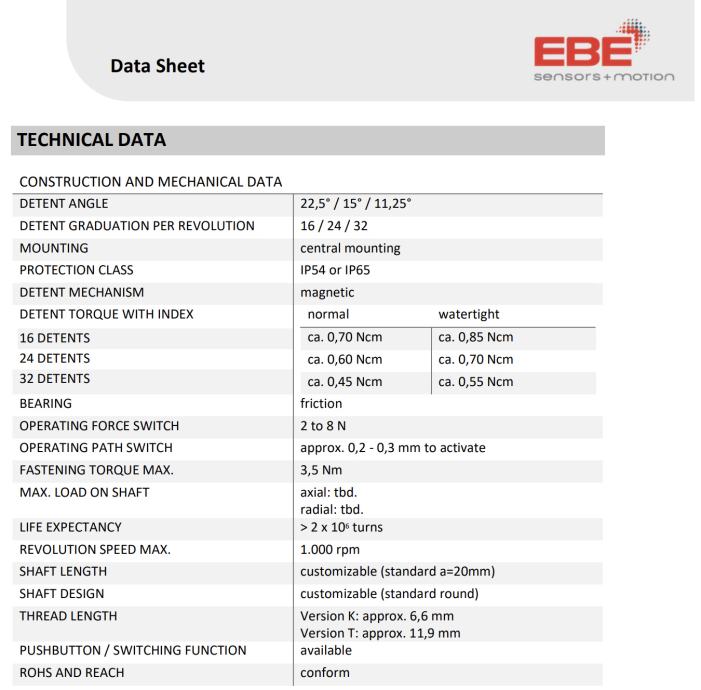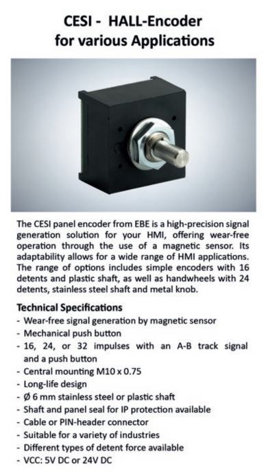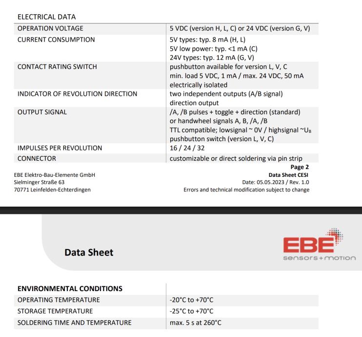 - EBE CESI rotacijski (HALL) enkoder, 24 pulsa, njemačke proizvodnje (EBE Elektro-Bau-Elemente GmbH), datasheet dostupan na službenim stranicama (Data Sheet CESI), novo