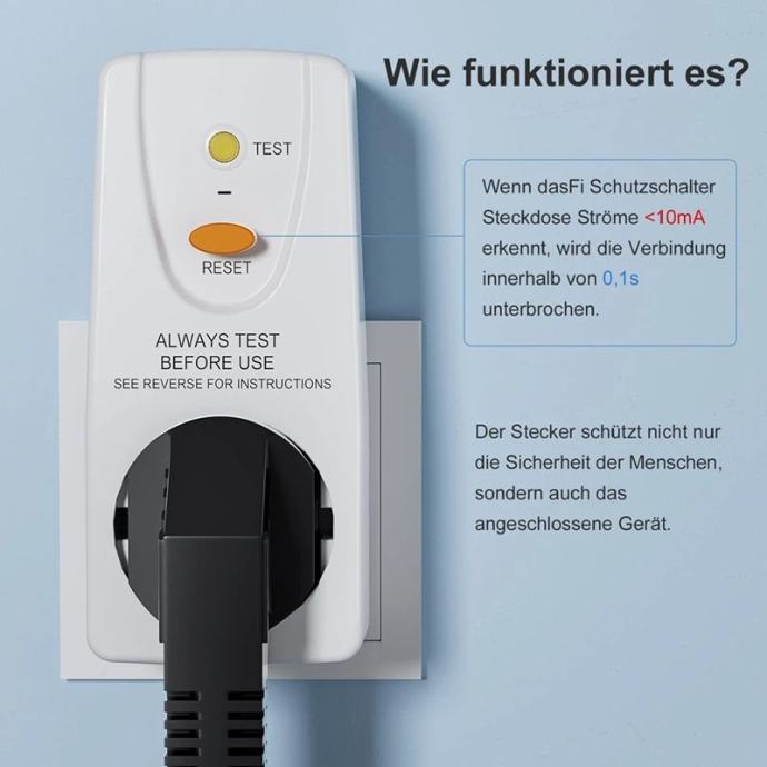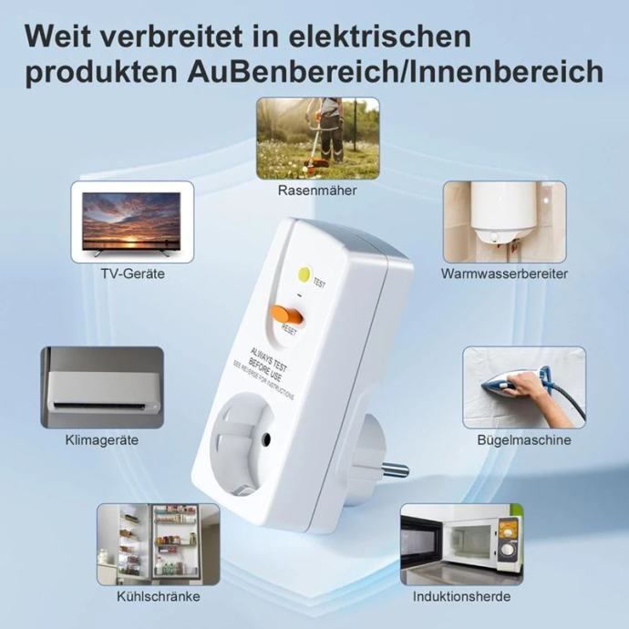 Universal Compatibility: Designed to fit all European standard plugs, this circuit breaker features a test circuit and a reset button. It is suitable for a wide range of electrical devices (AC 220-250V, up to 4000 W), including major appliances like refrigerators and air conditioners.