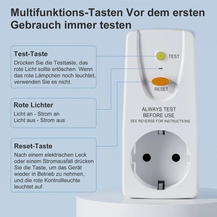 User-Friendly Operation: Ensure safety by following these steps: plug the device into a socket, press the 'Reset' button until the red light goes out, then press the 'Test' button to activate protection (red light will illuminate). Regular testing is recommended for optimal safety.