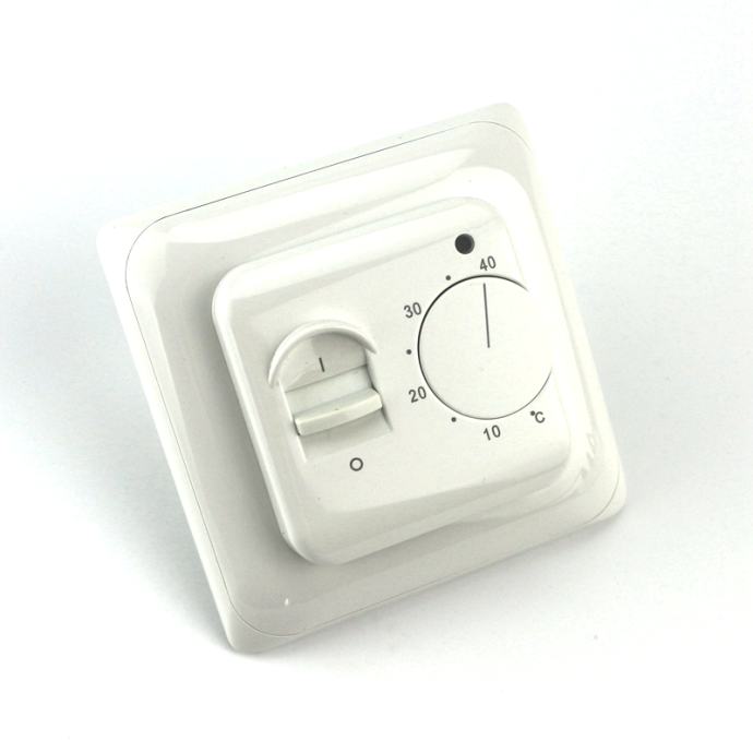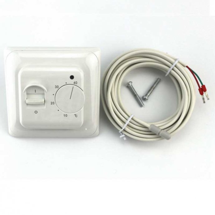 Jednostavan elektronski termostat HVAC M5.16 za podna električna grijanja. Mogućnost regulacije 5-40C, analogno podešavanje, prekidač i led indikacija uključenosti grijanja. Montira se u standardnu podžbuknu kutiju, NTC 10K sonda se nalazi na 3m kabela i montira se u pod.