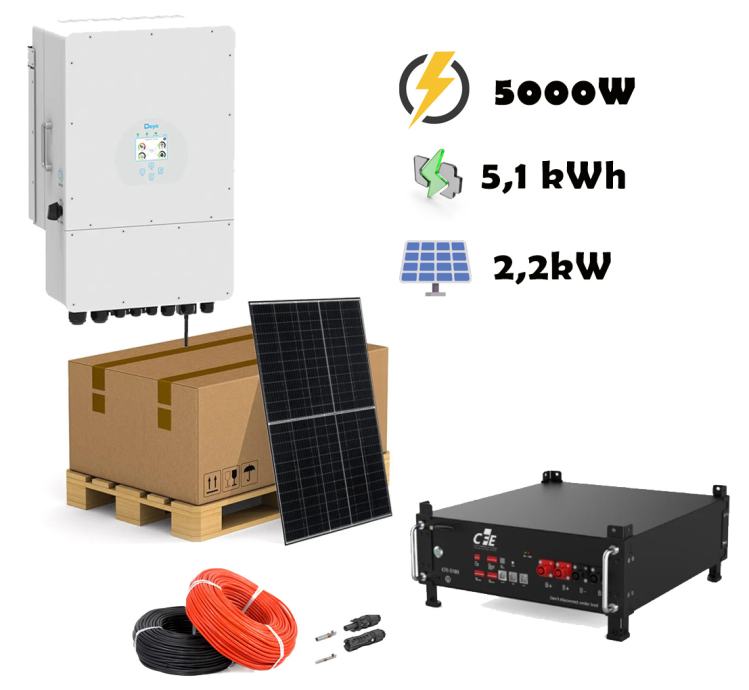 Komplet je sestavljen iz:DEYE 5kW hibridni razsmernik 1 fazni INVERTER IMA SODO ODOBRITEV 5 kosi Solarni paneli TRINA 445W 2 baterija Litij CFE 5100 z kapaciteto energije 5,1kWhPriložena vsa povezovalna oprema z konektorji in kabli ter varovalkami Za plačilo po predračunu - še dodatni popust!