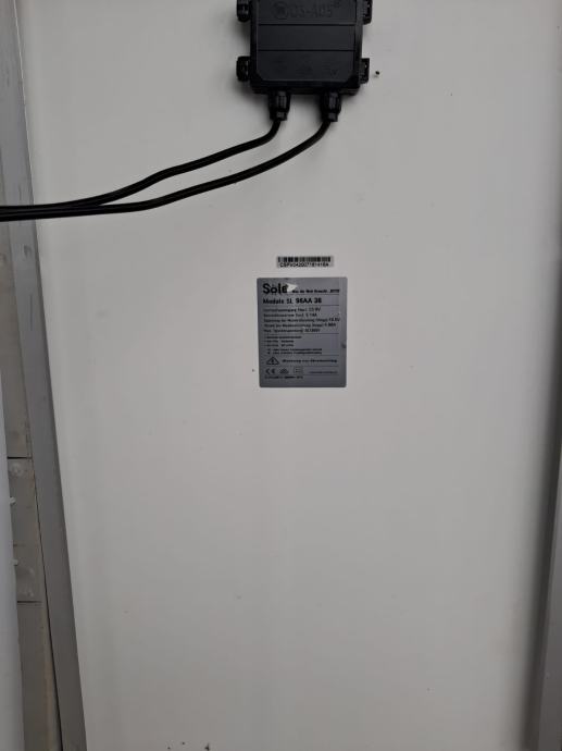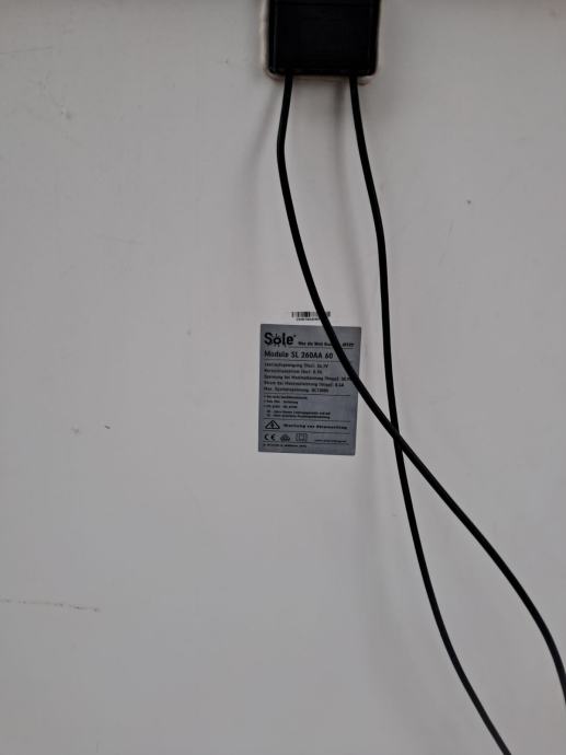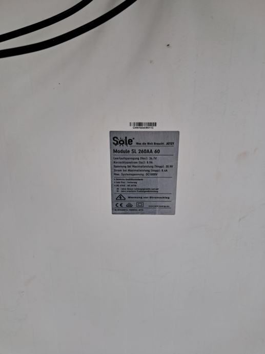Prodajem rabljene solarne panele Sole Module SL 260AA 60. Radi se o dva panela s MC4 konektorima i junction box priključnicama. Prema natpisnoj pločici, napon pri praznom hodu iznosi 36,7V, struja kratkog spoja 9,1A, napon pri maksimalnoj snazi 30,9V te struja pri maksimalnoj snazi 8,4A, s maksimalnom sustavnom naponom od 1000V.,