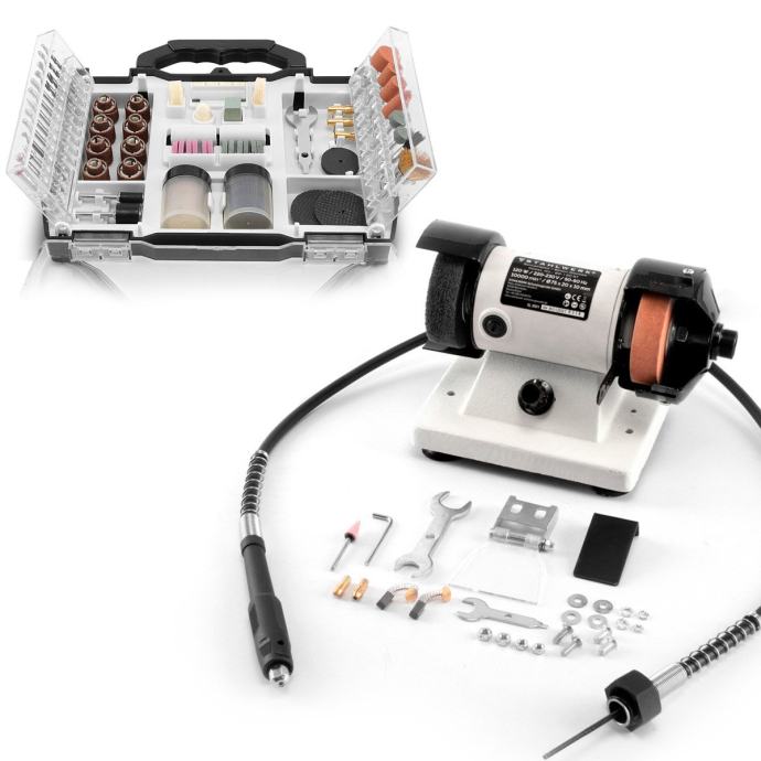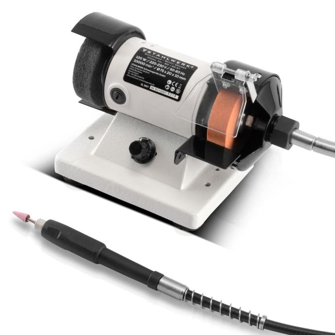 STAHLWERK BG-120 ST je kompaktna kombinacija 3 u 1 brusilice za rad na radnom stolu. Mali dvostruki mlin ima snagu od 120 W i radi do 10.000 okretaja u minuti. Kombinirana brusilica opremljena je brusnim kamenom i brusnim kotačem za fini rad. Uz STAHLWERK BG-120 ST višenamjensku brusilicu za radni stol, razni poslovi brušenja, brušenja, poliranja i ručni radovi u radionici mogu se brzo obaviti. Također je moguće izbrusiti i naoštriti noževe. Zahvaljujući fleksibilnoj osovini koja se može dodatno montirati, stolna brusilica se može fleksibilno koristiti s odgovarajućim alatima za drške za poliranje, skidanje ivica, graviranje i glodanje izradaka od drva, metala ili plastike.