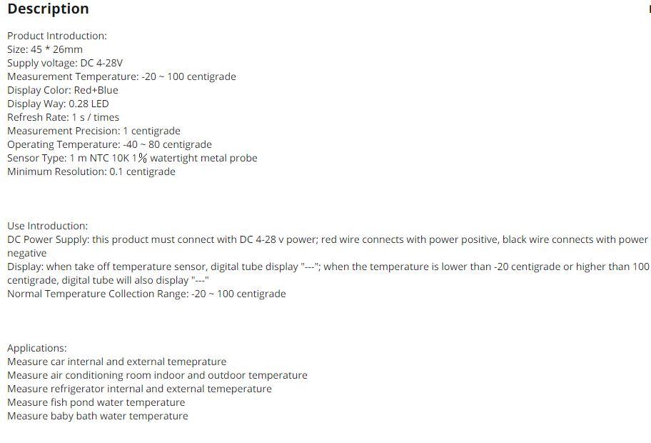Primjenjivo: automobil, temperatura tijela, bazen, akvarij, terarij, vivarij, rezervoari za vodu, hladnjak, industrijska oprema i sve vrste mjerenja temperature