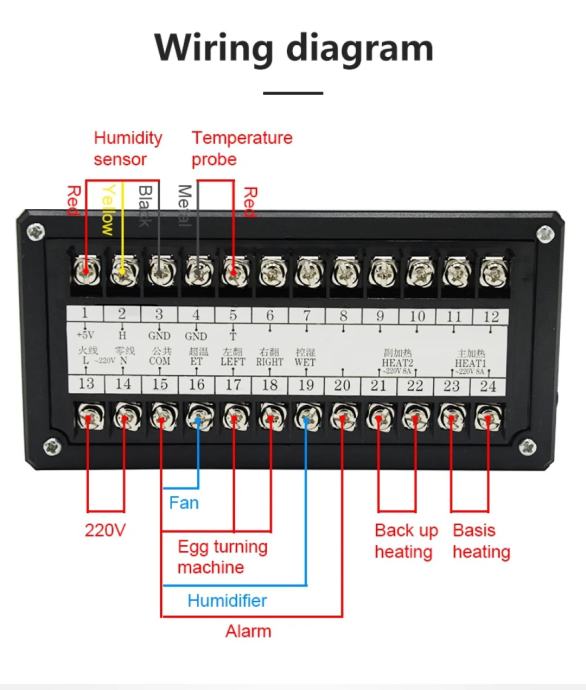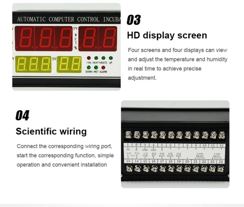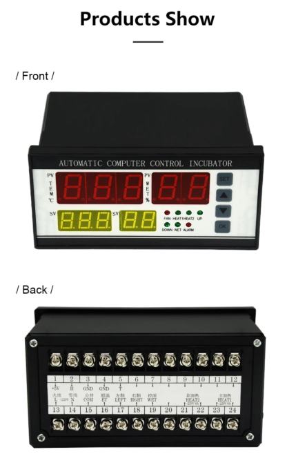 6.The maximum output load current: temperature control, insufficient temperature ≤ 8A/AC220V, over-temperature, egg left-turning, egg right-turning, humidity control, alarm ≤ 1A / AC22