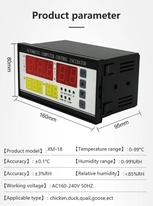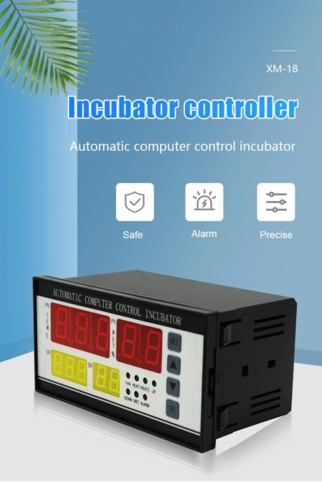Termostat elektronika inkubatora XM-18ZP 220v, u jednom kučištu je termostat, higrostat, tajmer ventilatije i tajmer okretanja jaja . Upravljački sustav za srednje i velike inkubatore, dolazi s priloženom sondom za temperaturu i sondom za mjerenje vlage.