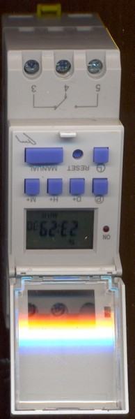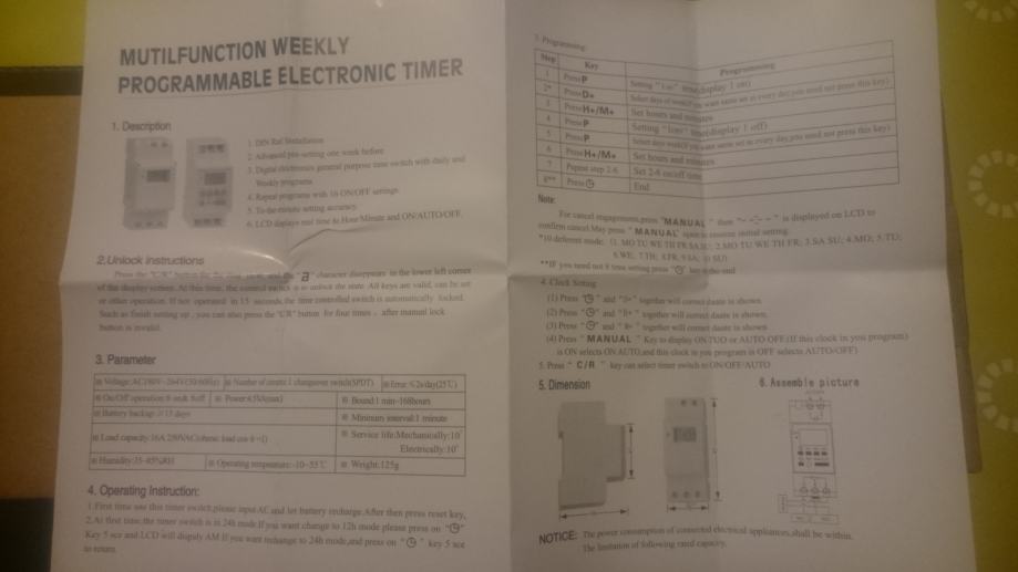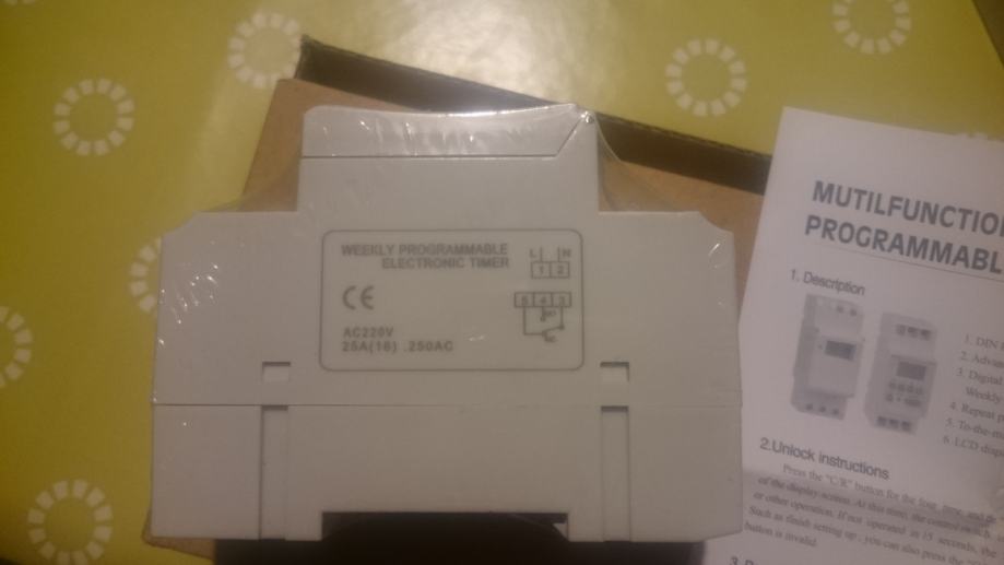Prodaje se nov,nekorišten timer koji se može isprogramirati u 17 različitih vremena(ON-OFF stanje):Programira se za 7 dana, svaki dan zasebno,samo vikend,svaki treći dan,svi dani osim nedjelje.... Uz timer dolazi i uputstvo i tehnički podaci.Najmanje programirano vrijeme je 1minuta.Radni napon je 220V.Na sebi ima mirno-radni kontakt, sve je naznačeno u shemi. Pogodan za različite namjene, hranjenje životinja, uključivanje i isključivanje različitih uređaja. Može se spojiti sa sklopnikom za upotrebu kod većih potrošača, grijalice,elektromotori...