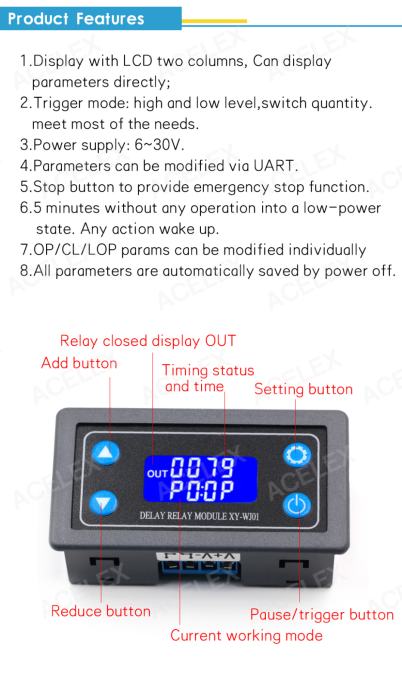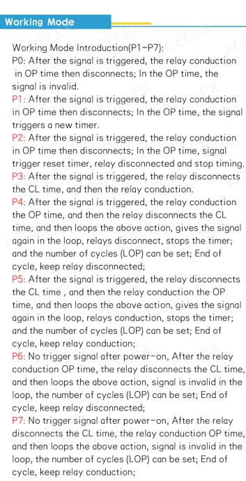 P2: After the signal is triggered, the relay conduction in OP time then disconnects; In the OP time, signal trigger reset timer, relay disconnected and stop timing.