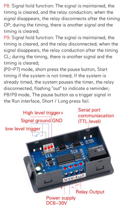 P8: Signal hold function: The signal is maintained, the timing is cleared, and the relay conduction; when the signal disappears, the relay disconnects after the timing OP; during the timing, there is another signal and the timing is cleared;