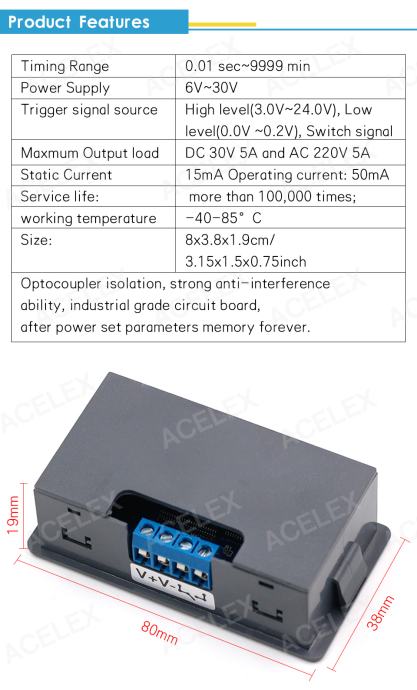 1. Trigger signal source: High level(3.0V~24.0V),Low level(0.0V ~0.2V),Switch signal.