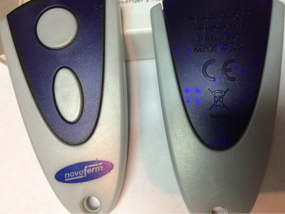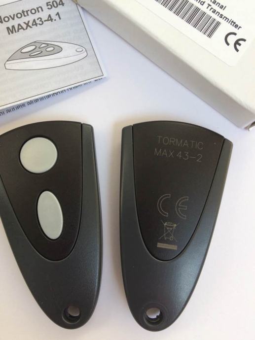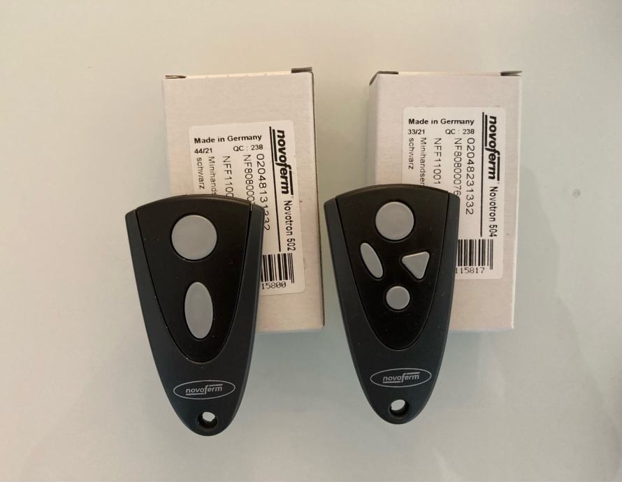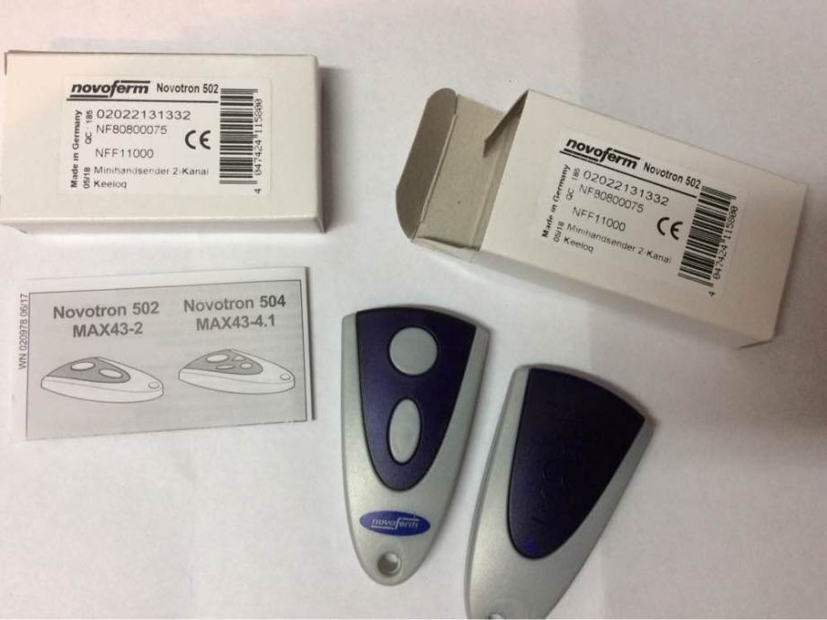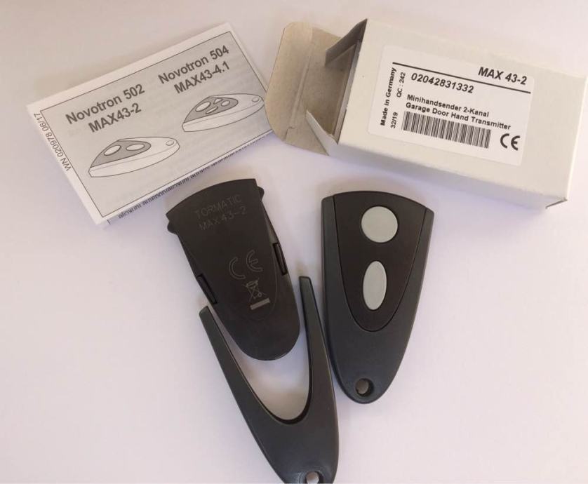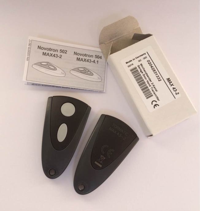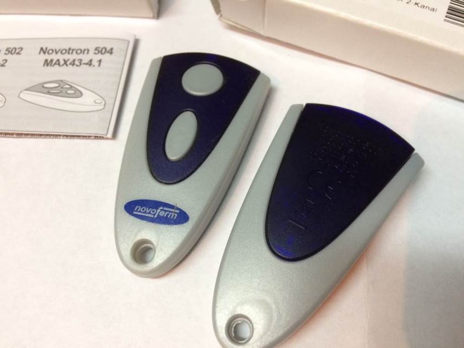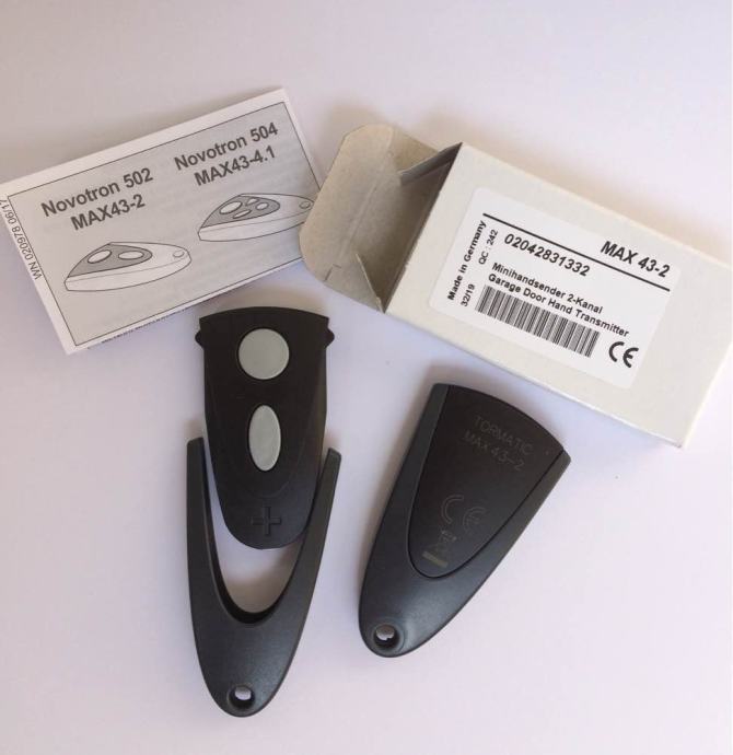 Prodajem novu (crno kučište) i staru (srebrno kučište) verziju NOVOFERM TORMATIC NOVOTRON 502 MAX43-2/4 daljinski upravljač za sve tipove motora Novodoor, Novoferm, Tormatic, NovoPort, Novomatic, NovoRol, Trafimatic Plus, NovoGate/NovoSwing na frekvenciji od 433,92 MHz. Daljinski upravljač je u dvobojnoj kombinaciji crne i sive boje (ili srebrnoj i plavoj boji) s dvije tipke za različite funkcije. Primjerice jedna tipka otvara vrata, a druga tipka zatvara ili kombinirate ove funkcije na jednoj (prvoj) tipci, a drugom tipkom kontroliramo svjetlo na motoru garažnih vrata. Na završetku daljinskog upravljača je otvor za privjesak na koji se mogu staviti ključevi.