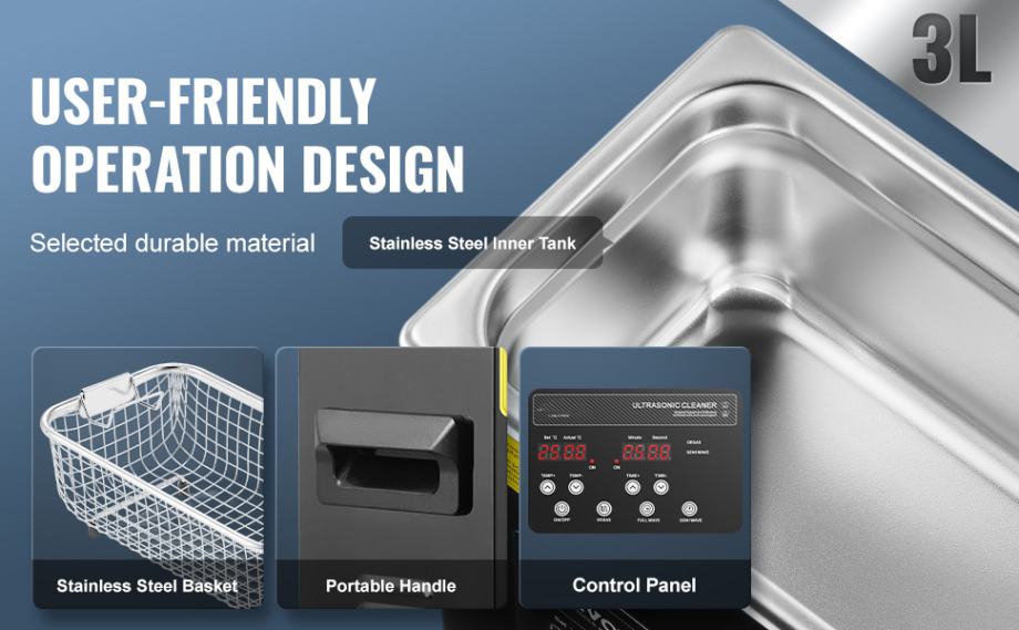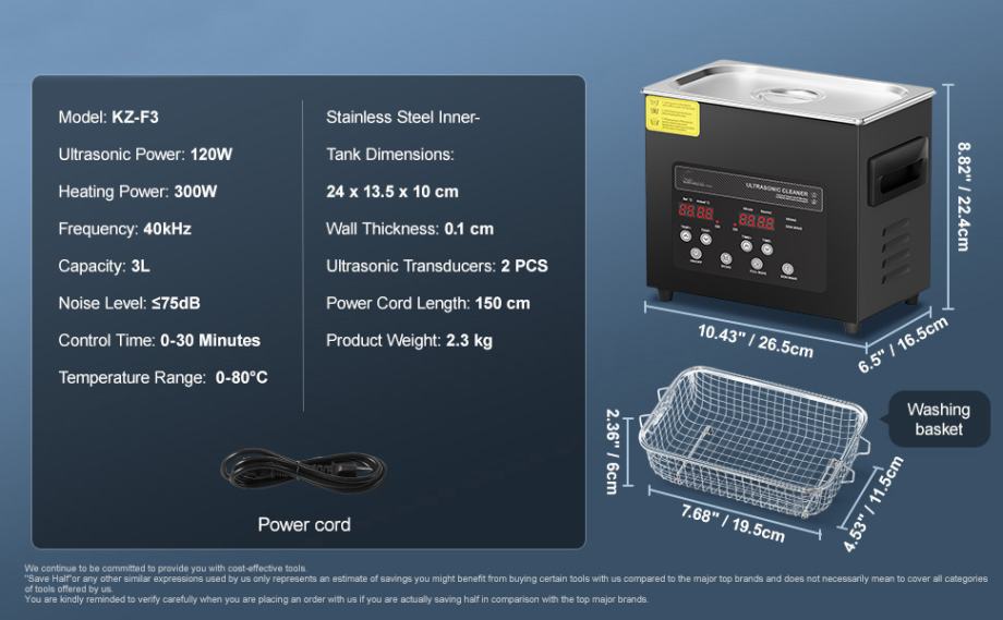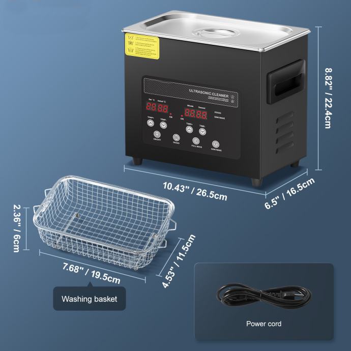 Tank Capacity: 2.8-3L (Since the bottom of the ultrasonic cleaner is a curved surface, the actual volume will be smaller.)