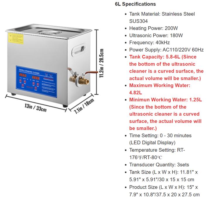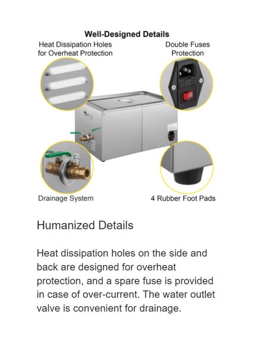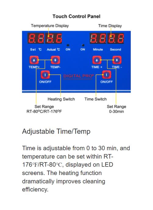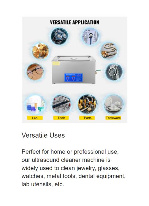 Uređaj je predviđen za ultrazvučno čišćenje raznih metalnih, plastičnih i bakrenih predmeta: novčića (kovanica), naočala, zubnih proteza, kazeta za štampače kao i: dijelova motora, djelova bicikala, rasplinjača (karburatora), u zubnoj tehnici te opreme za golf, štapova, loptica itd. ventila, raznih metalnih dijelova, nakita, leća, zdravstvenih pomagala,