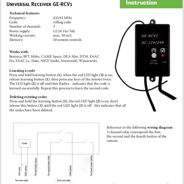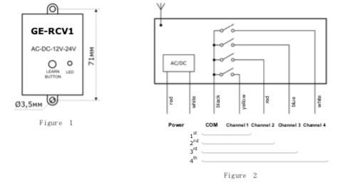 Prodajem novi zapakirani univerzalni prijemnik GE-RCV1 sa četiri kanala na 433,92 MHz. Dvožilni kabel namjenjen je za napajanje za 12/24V, a peterožilni kabel za povezivanja do četiri kanala.