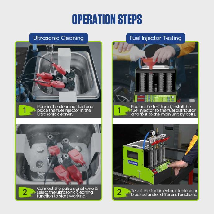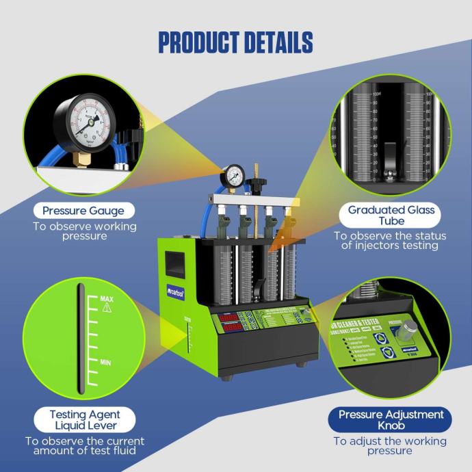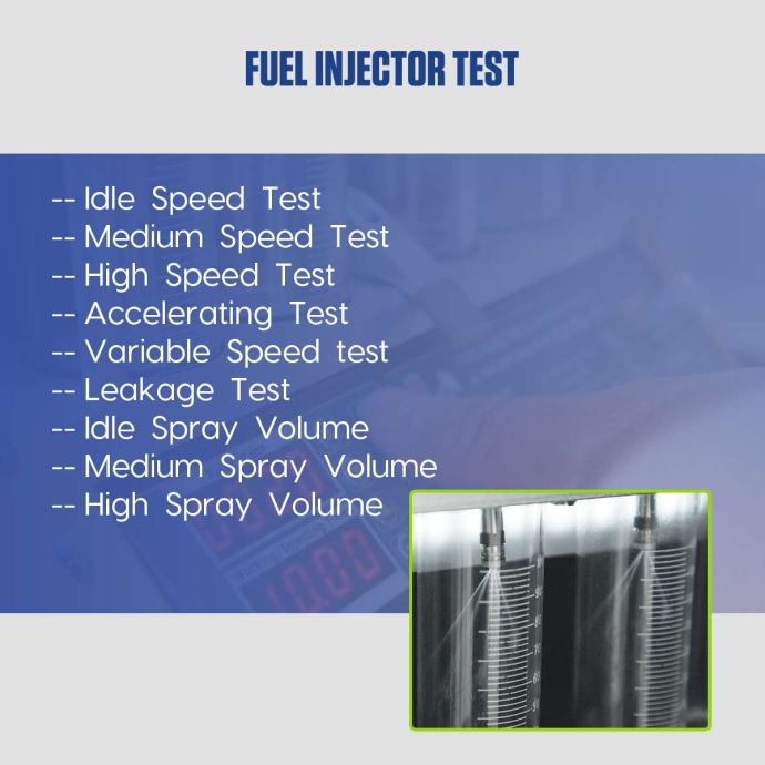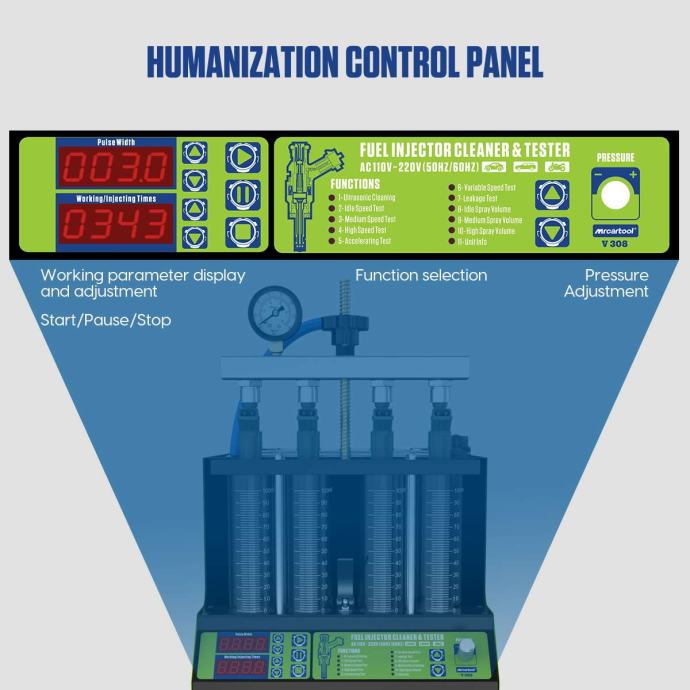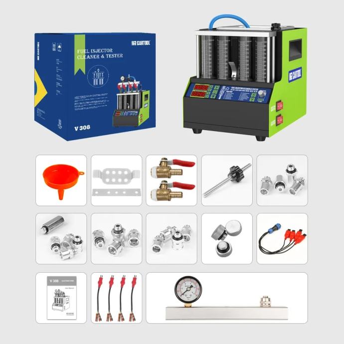 Širok raspon primjena: V308 uređaj za čišćenje t testiranje ubrizgivača goriva za automobile ima dobru kompatibilnost. Podrška za više automobila i motocikala za 'čišćenje' i 'testiranje' mlaznice za gorivo. Također se može koristiti za 'čišćenje' mlaznica dizel goriva.