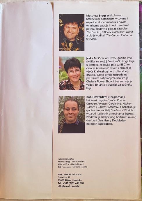 ‘Enciklopedija voća, povrća i začinskog bilja’ kombinacija je triju knjiga čiji su autori poznati vrtlari Bob Flowerdew, Matthew Biggs i Jekka McVicar. Knjiga je detaljan vodič kroz odabir, uzgoj, berbu i pripremu voća, povrća i začinskog bilja. Priznata stručnost autora na njihovim poljima i njihove godine praktičnog iskustva spojene su u jedinstvenu i odličnu knjigu. 100 vrsta voća, 70 vrsta povrća i 100 vrsta začinskog bilja s preko 800 fotografija čine ovu knjigu najkompletnijim i najsveobuhvatnijim priručnikom za sve koji žele imati bogat i plodan vrt. Knjiga je prekrasno ilustrirana, s jasnim i preglednim tekstom koji obuhvaća sorte, uzgoj, slaganje kultura, štetnike i bolesti, ljekovita svojstva, uporabu u kulinarstvu, kozmetici i medicini.