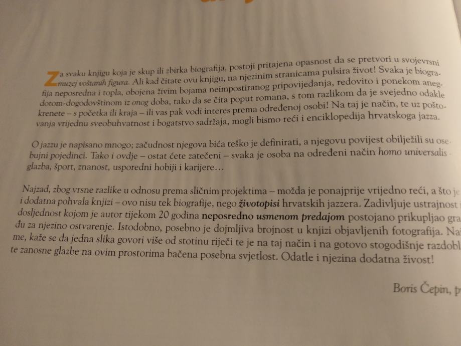 Za knjigu je odabran veliki broj fotografija, većinom iz privatnih arhiva te arhiva autora. Tvrdoukoričena, enciklopedijski opsežna monografija na petstotinjak stranica predstavlja gotovo stogodišnji raspon jazza u Hrvatskoj, te skuplja dokumentarnu, povijesnu i glazbenu građu.