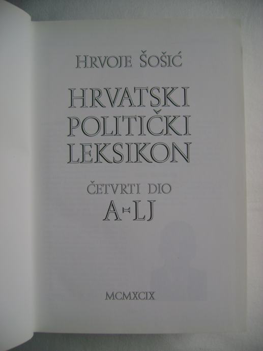 Hrvoje Šošić - Hrvatski politički leksikon A-LJ (četvrti dio, kazalo imena) - izdavač Eurocopy pack, Zagreb 1999. godine, 18 x 24 cm, tvrdi uvez, stranice 1559-2793, bogato ilustrirano.