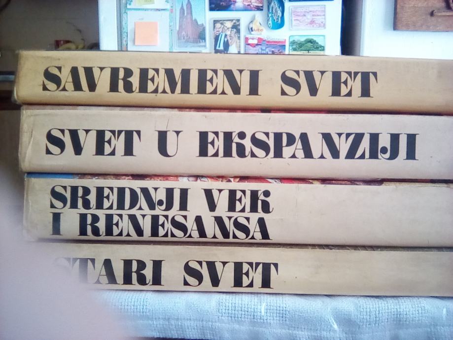 Enciklopedija svijeta u četiri knjige, preko 1400 stranica.Knjige su bogato opremljene orginalnim fotografijama osoba, građevina, umjetnina, povijesnim kartama, kronološki prikaz važnih događaja. Politika, ratovi, znanost, umjetnost, sve opisano. Knjige su jako dobro očuvane i imaju omote( vidljivo na slikama). Može zamjena za filateliju ili novčanice.