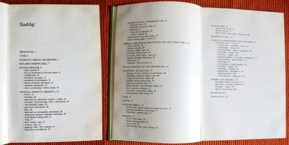 Knjiga govori o samim osnovama akvaristike, akvariju, kvaliteti i osobinama vode.. te najveća je vrijednost ove knjige u kvalitetnim fotografijama akvarijskih biljaka i riba koja početniku omogućuje lako identificiranje pojedinačne vrste.