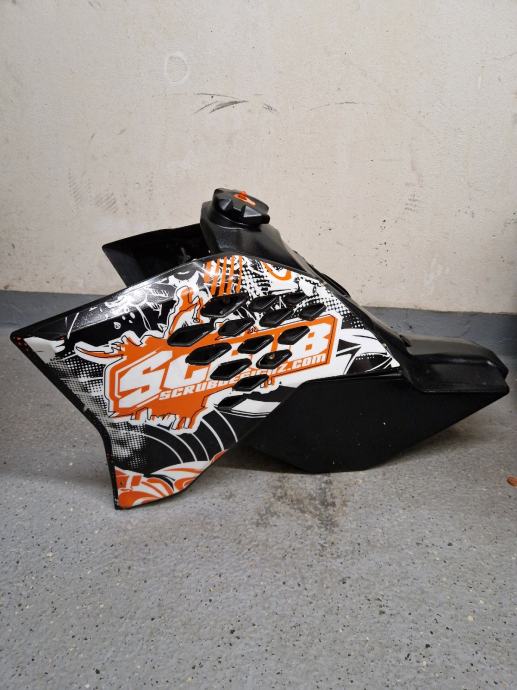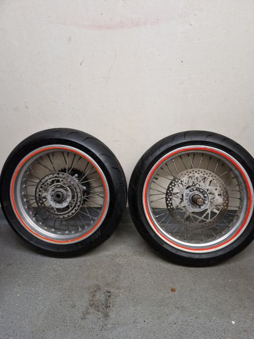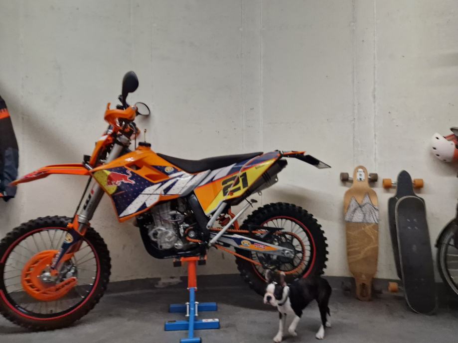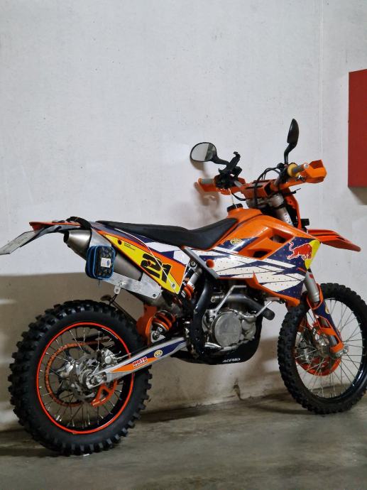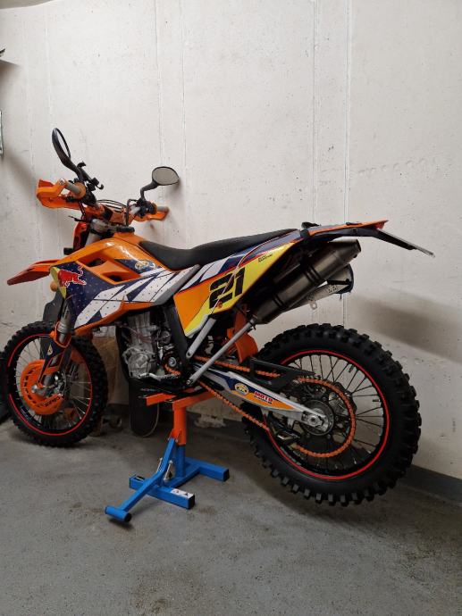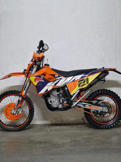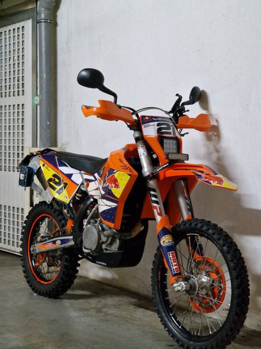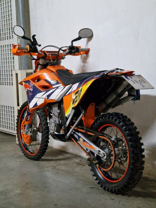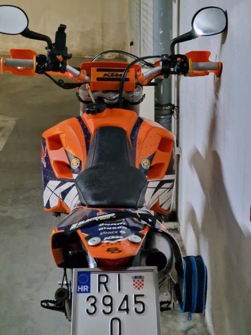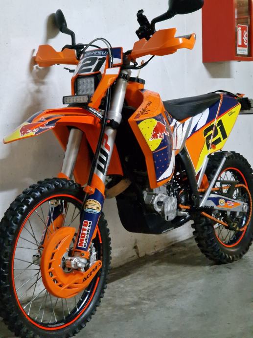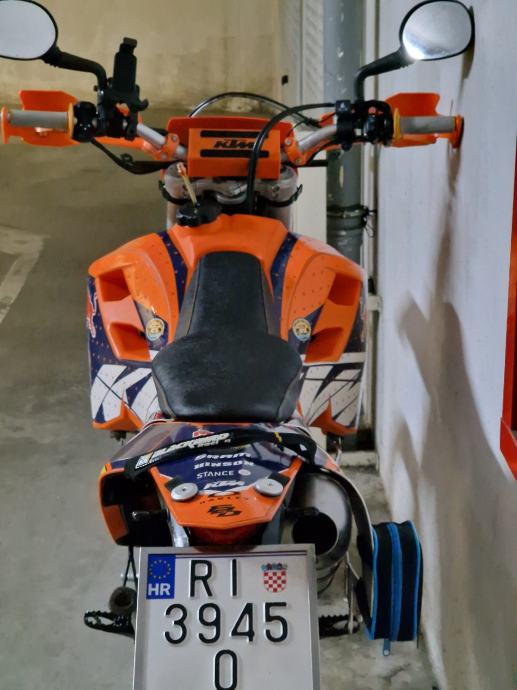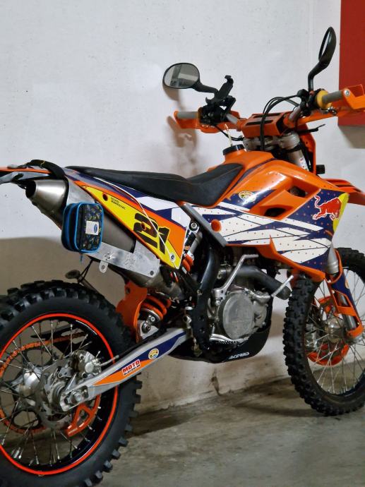 Motor ima 82 radna sata, dva seta kotaca sa novim kočionim diskovima, gumama, zupčanicima i lancima, posebno jedan set za enduro a drugi za super moto, na enduro gumama stavljen moouss, full titatn akrapovic sa granom,štitnik prednjeg i zadnjeg diska, dodatno ugrađeni jaci ventilatori, dva rezervoara jedan orginalan cca 8l, drugi cca 20l, po naruđbi rađeni alu štitnici za bisage, led svijetla plus reflektor i maglenke koje nisu na slikama, sic rađen po narudbi koji je mekad i puno udobniji od orginalnog, sa protukliznom navlakom, štitnik mašine, motor je registriran i koristen samo za vožnju makadamskim putevima tako zvani TET, super moto gume stavljene jednom na motor cca mj dana i od tad stoje jer mi se to ne sviđa a ujedno ovo je treci motor u garazi tako da imam druge sta su mi bolji za voznju po cesti. Motor je u besprijekornom stanju bez ulaganja, prije 0h promjenjeno ulje, filter, disk plocice, ulje u kocnicama, filter zraka!