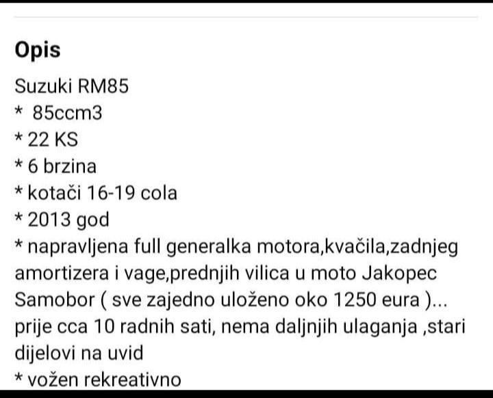 Prodajem rabljeno vozilo: Suzuki RM 85