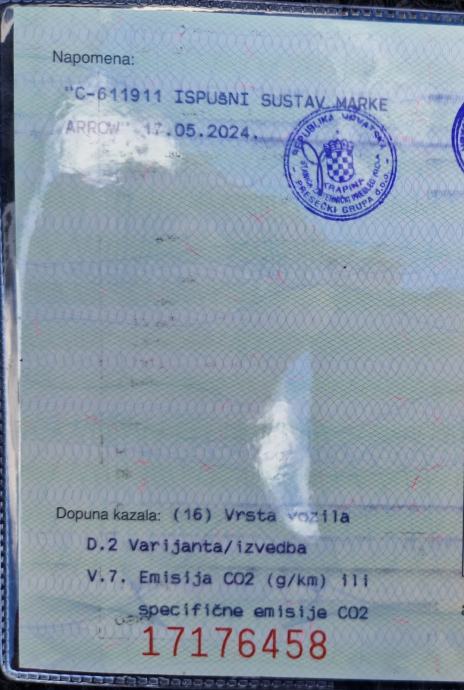- kompletni ispušni sustav ARROW kojemu je cijena 1300 eura (i grane i ispušni lonac) koji je upisan u prometnu dozvolu) i motoru daje fenomenalan zvuk - motor prede. Uz motor dajem i originalan kompletni ispušni sustav;