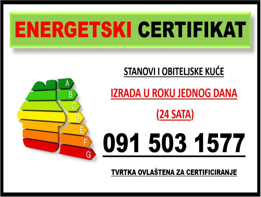 Izrada energetskih certifikata za sve vrste zgrada (stambenih zgrada (stanovi, obiteljske kuće, zgrade) i nestambenih zgrada). Kontakt: 091/5031577